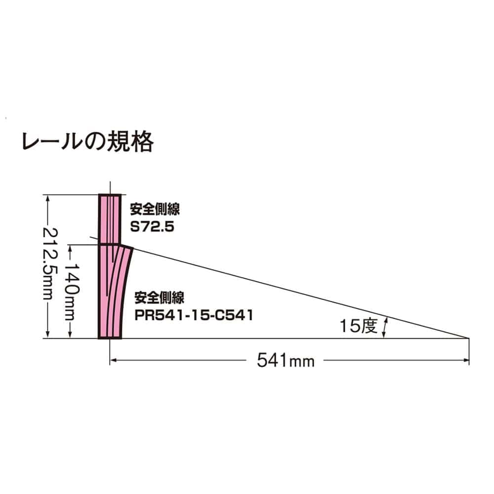 ●安全側線レールPR541-15-C541-SY(F)は乗越しポイントを模したレール部品で140mmの直線部分と半径541mmの曲線部分からなるポイントレールの形をしていますが、直線部分はダミーのレールとなっていて車両は曲線部分のみ走行が可能です。