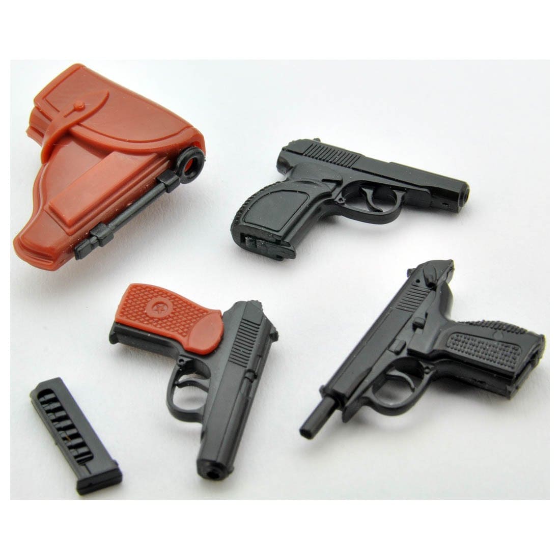 本キットは、ハンマーの起倒、スライドの後退状態など自動拳銃らしいアクションを各形状で再現。グリップや革製ホルスター部には茶色の成型色を使用。ホルスター用ベルトとして使えるゴムバンドも付属。マカロフは3種のグリップが選択可能。計6挺入りのセット品。