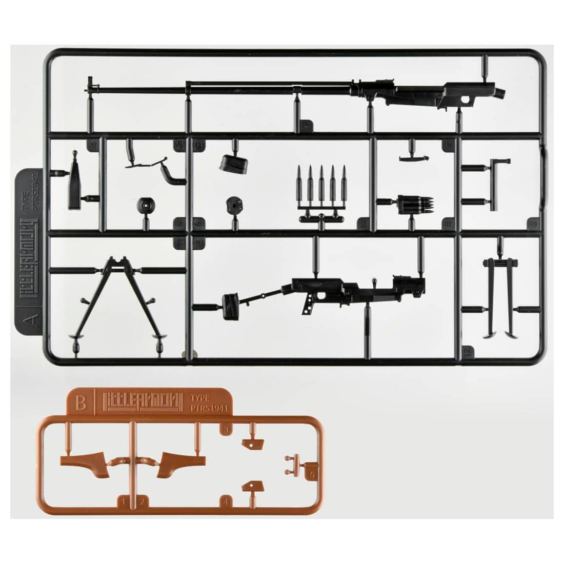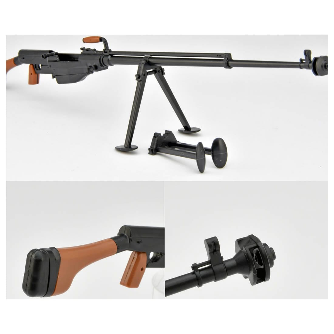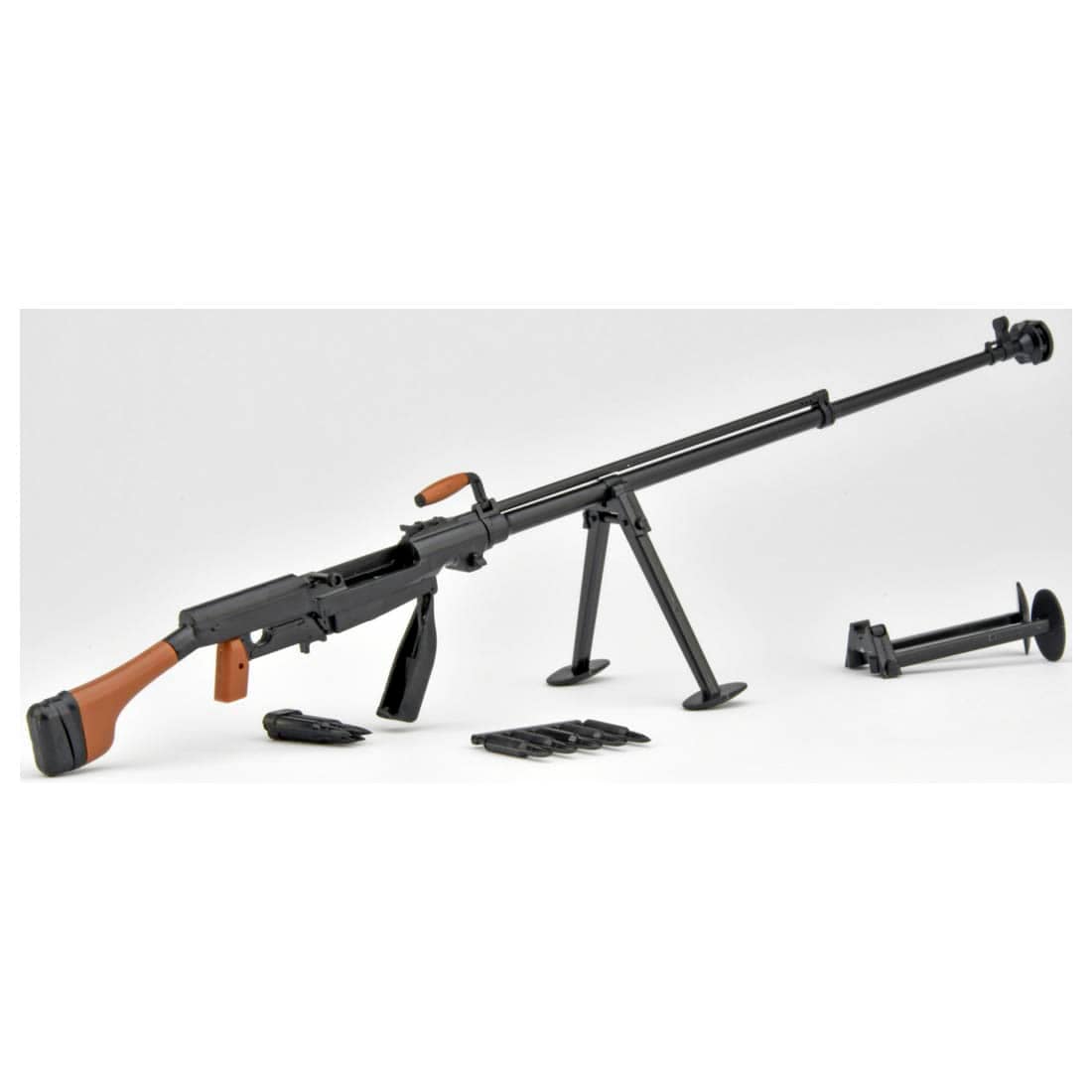 本製品は本製品は「陸上自衛隊 武器学校」の取材を通じてPTRS1941の長大な姿を1/12スケールで模型化。固定マガジン状態の選択やボルト可動など構造的な"らしさ"も再現。成型色は茶と黒の2色使用。