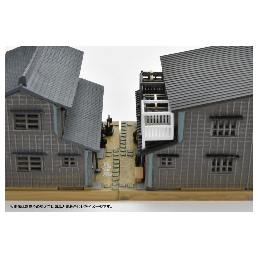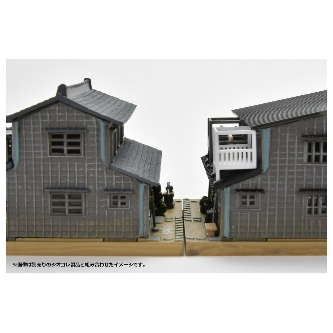 別売りの「建コレ054−1R 商店長屋A1R」と背中合わせに組み合わせて情緒豊かな路地裏を再現可能です。