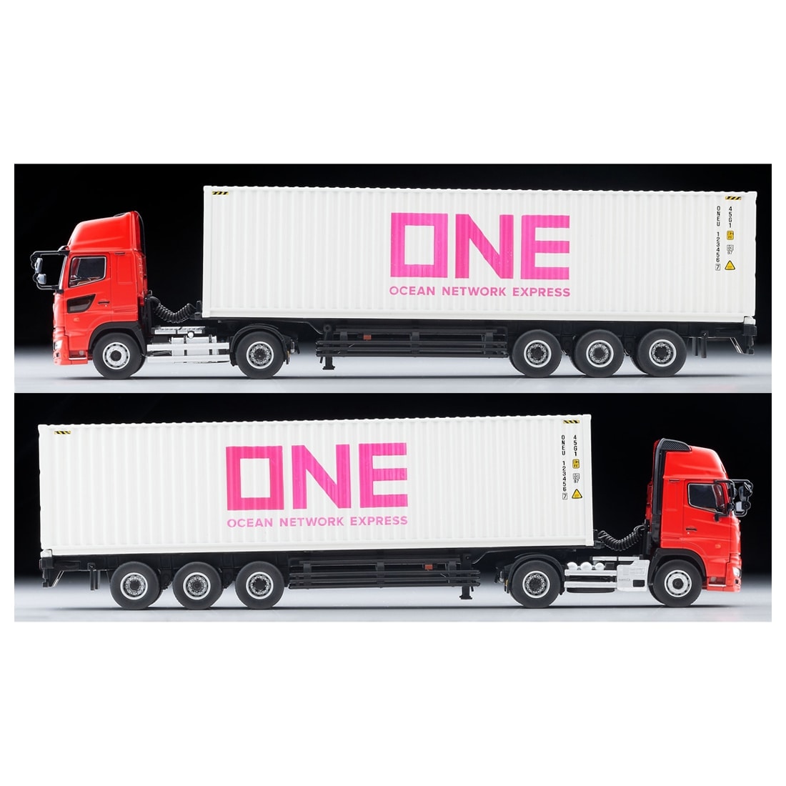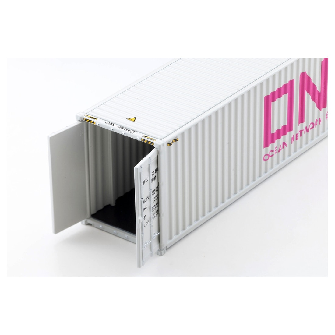 今回、コンテナはオーシャンネットワークエクスプレス(ONE)の「グレーコンテナ」仕様を再現しました。