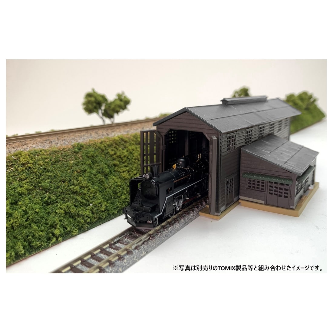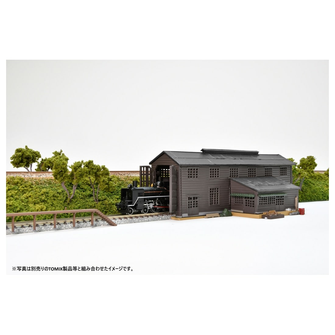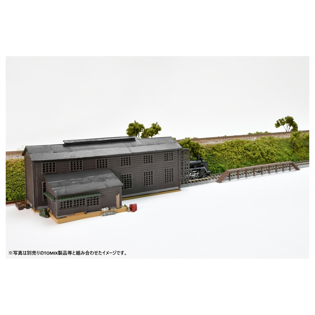 セット内容: 電車庫、作業所、洗車台、小物(ドラム缶、金属ごみ置き場等)