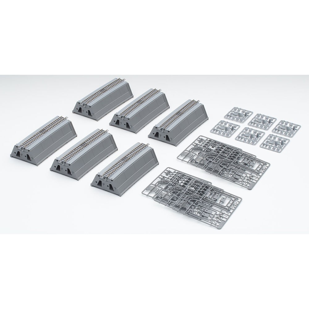 POINT:築堤初の木製枕木タイプでカント付きのカーブレール・コンクリートタイプと鉄骨タイプの二種類の門型単線架線柱が付属・別売の線路脇アクセサリーセット1が取付けられる側溝の蓋を模した部品や機器箱、別売の上路式ガーダー橋用の架空裸線路柱(鉄骨タイプ)が付属