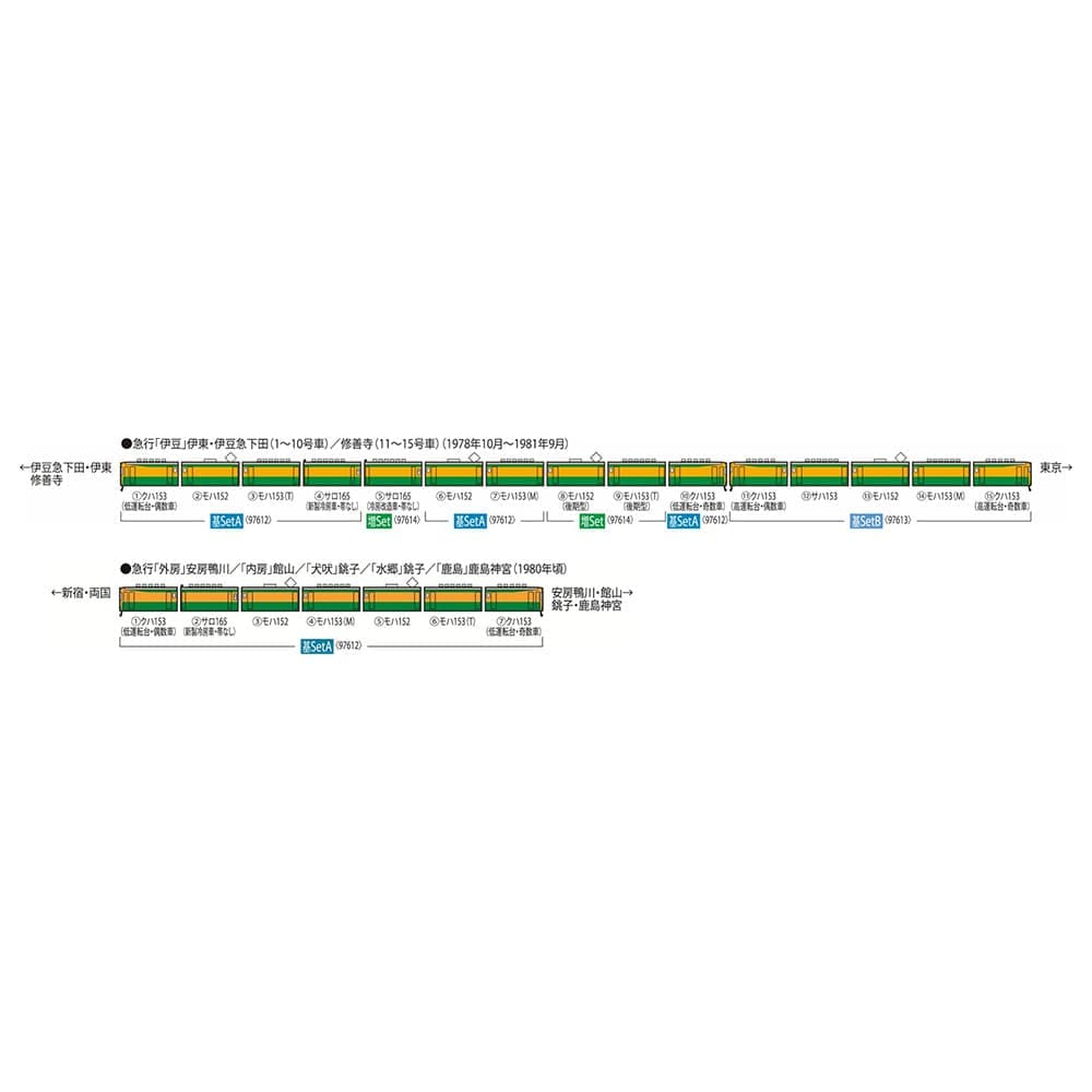 ●クハ153・モハ152・153とサハ153の5両セットで、本製品と<97612><97614>の組み合わせで15両編成の急行伊豆を再現可能