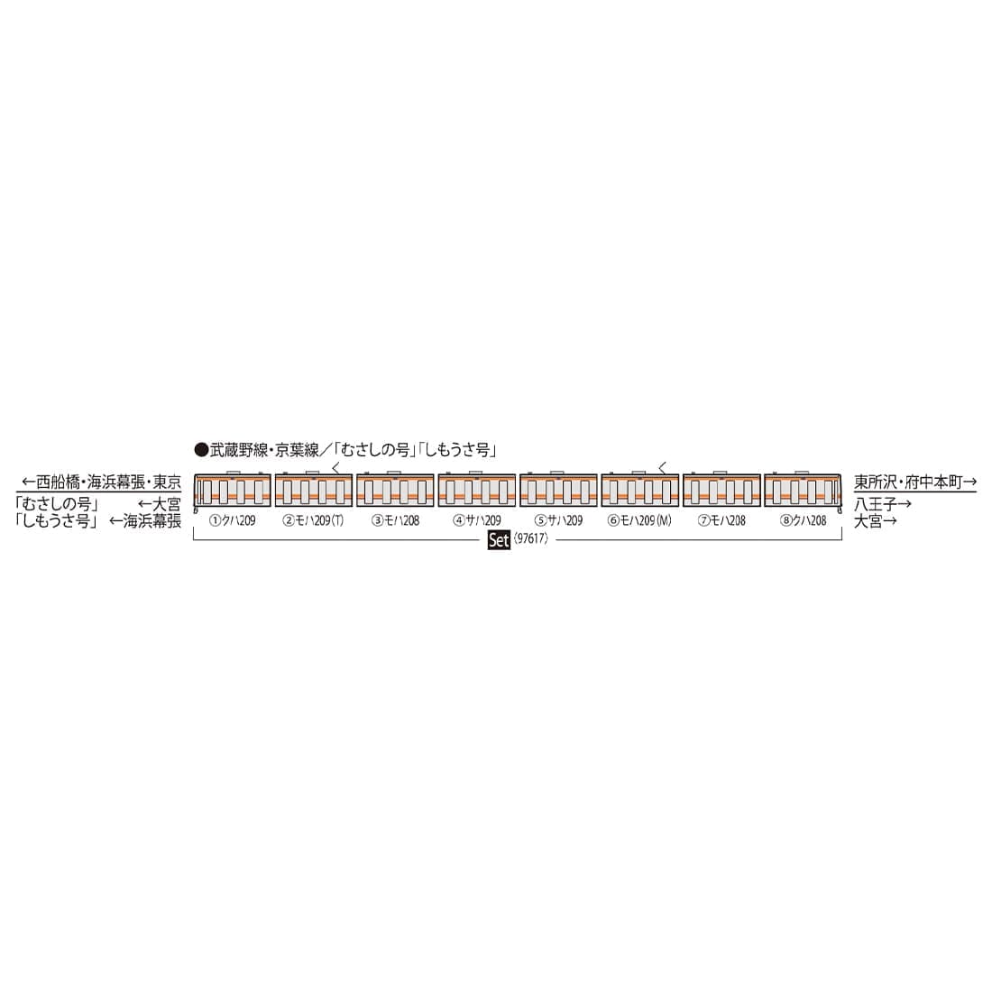 クハ209-500×1 モハ209-500(M)×1 モハ208-500×2 サハ209-500×2 モハ209-500(T)×1 クハ208-500×1