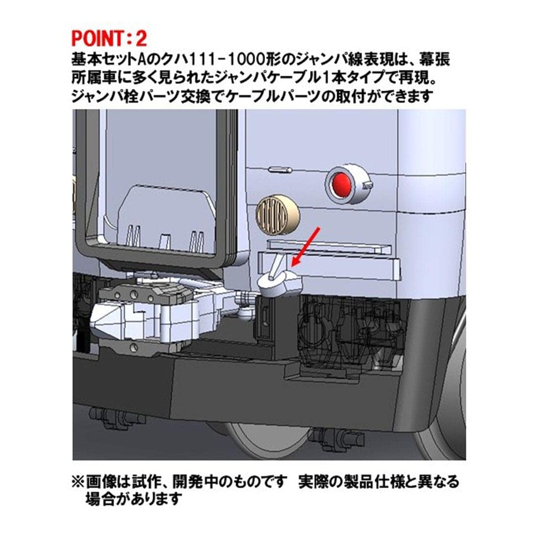POINT 2:基本セットAのクハ111-1000形のジャンパ線表現は、幕張所属車に多く見られたジャンパケーブル1本タイプで再現。ジャンパ栓パーツ交換でケーブルパーツの取付ができます