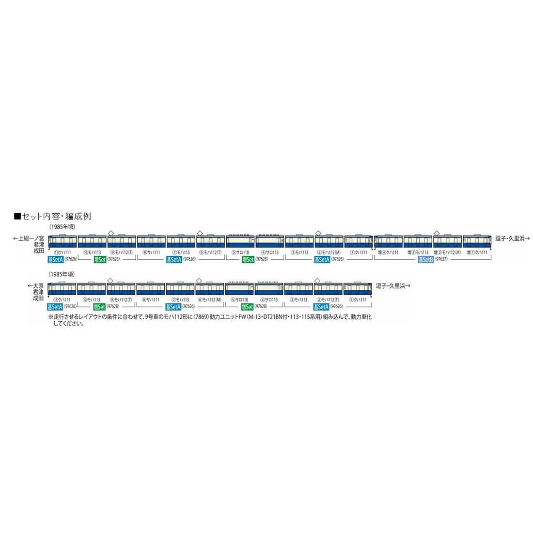 横須賀線・総武快速線で活躍した113系1000番代の7両セット。増結セットと組み合わせてグリーン車付きの11両編成を再現可能