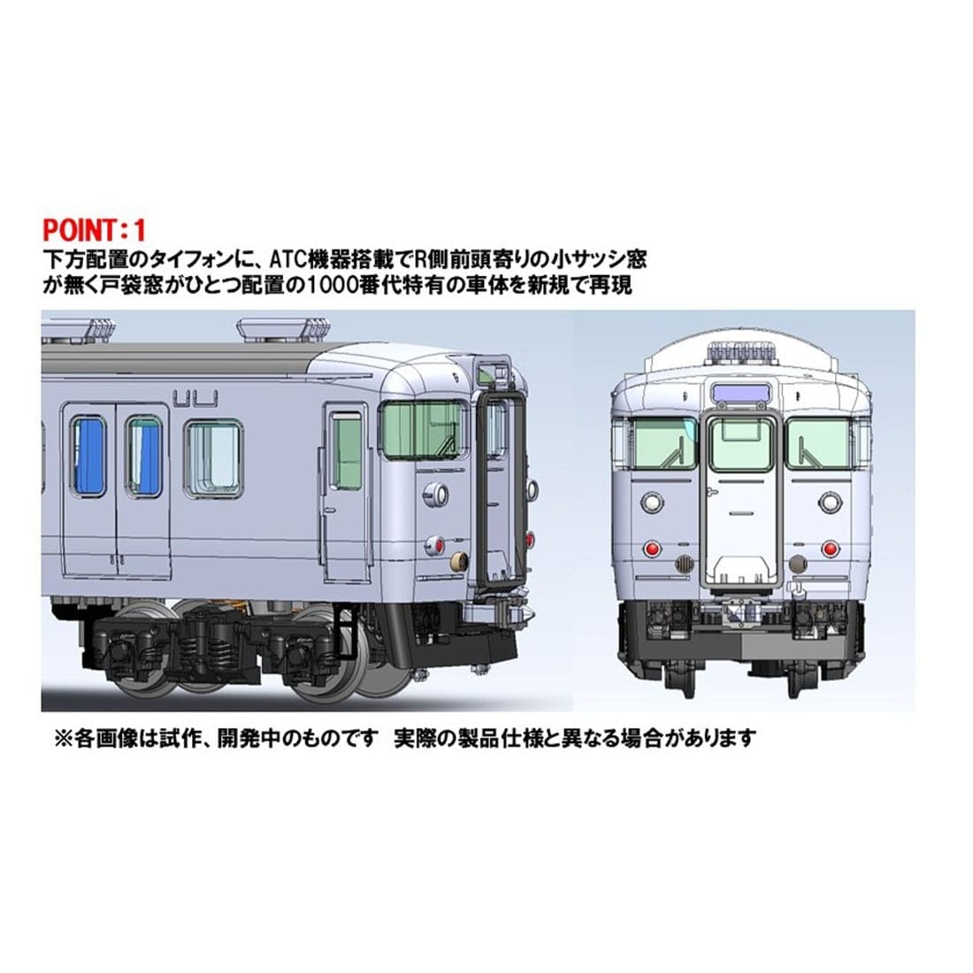 POINT 1:下方配置のタイフォンに、ATC機器搭載でR側前頭寄りの小サッシ窓が無く戸袋窓がひとつ配置の1000番代特有の車体を新規で再現