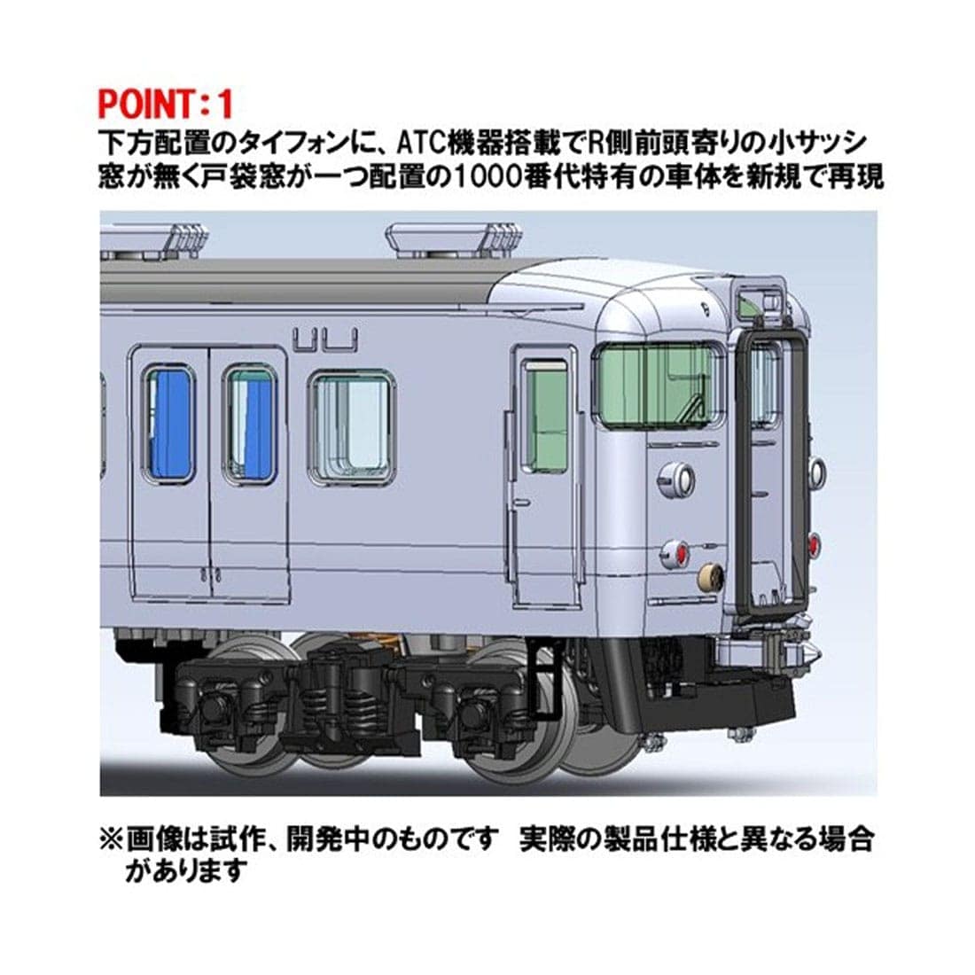 POINT 1:下方配置のタイフォンに、ATC機器搭載でR側前頭寄りの小サッシ窓が無く戸袋窓がひとつ配置の1000番代特有の車体を新規で再現