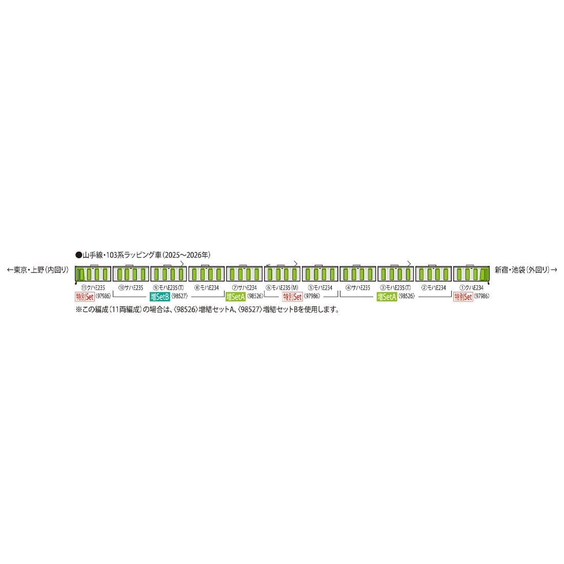 ●本製品と(1・5・6・11号車)と増結セットA<98526>、増結セットB<98527>で 11両フル編成が再現可能