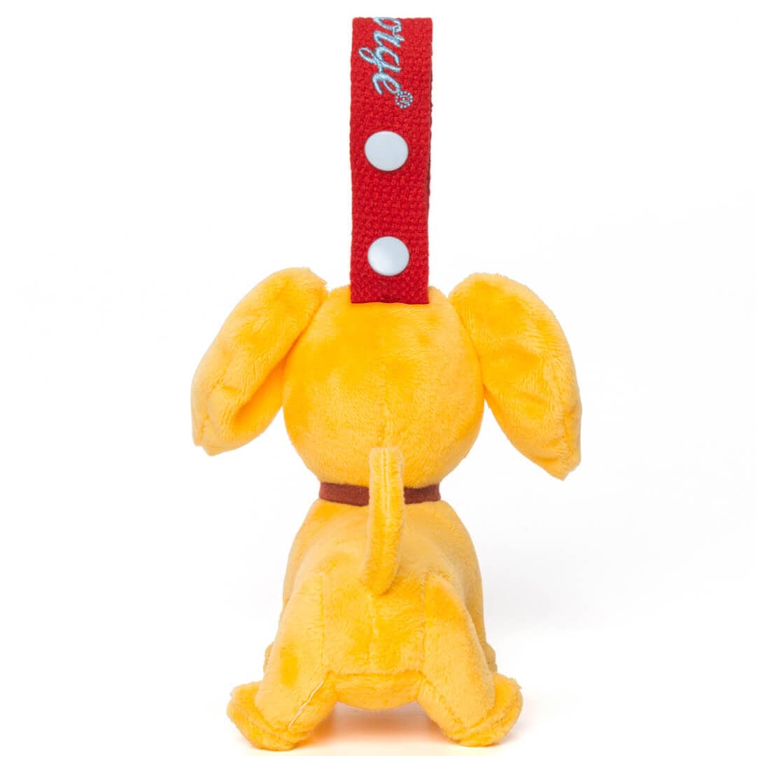ぬいぐるみマスコットに刺繍ロゴ入りの色違いストラップを付けています