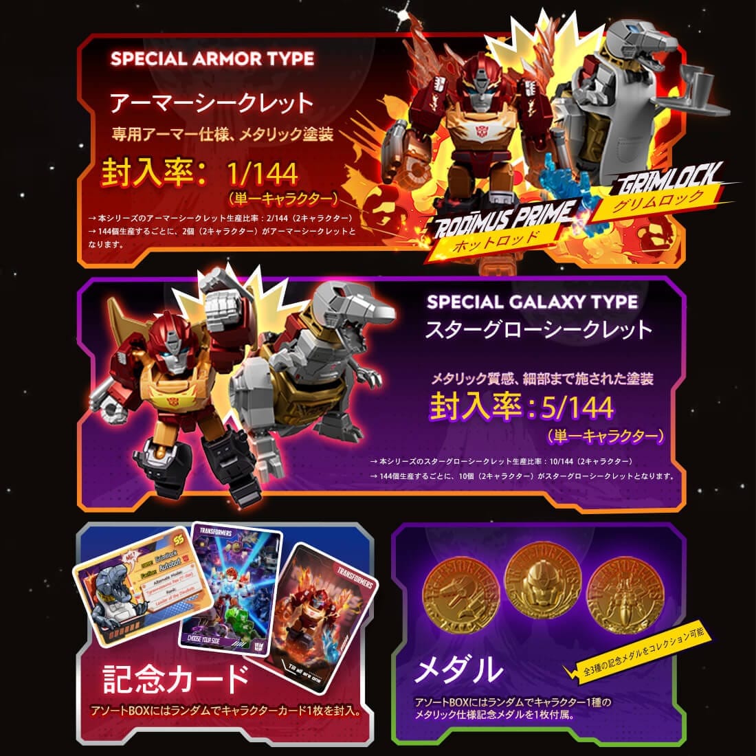 また、各ボックスにはキャラクターカードが1枚付属します。さらに、アソートBOX(12個入り)ごとに、ランダム仕様のコレクション用スペシャルカードが各1点封入されており、