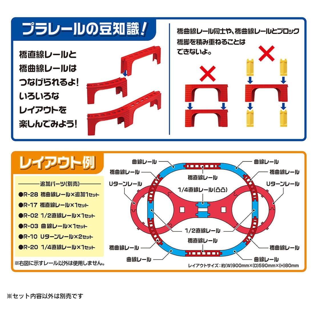 橋曲線レールや、別売りの「R−17 橋直線レール」とたくさんつなげることで、迫力ある長い橋を作ることができます。