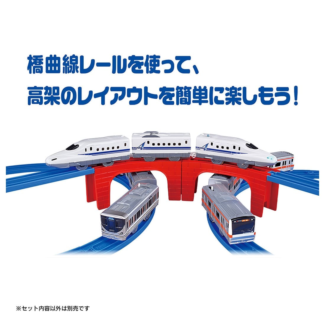 橋脚と曲線レールが一体になっているため、高架のレイアウトを簡単に作ることができます。