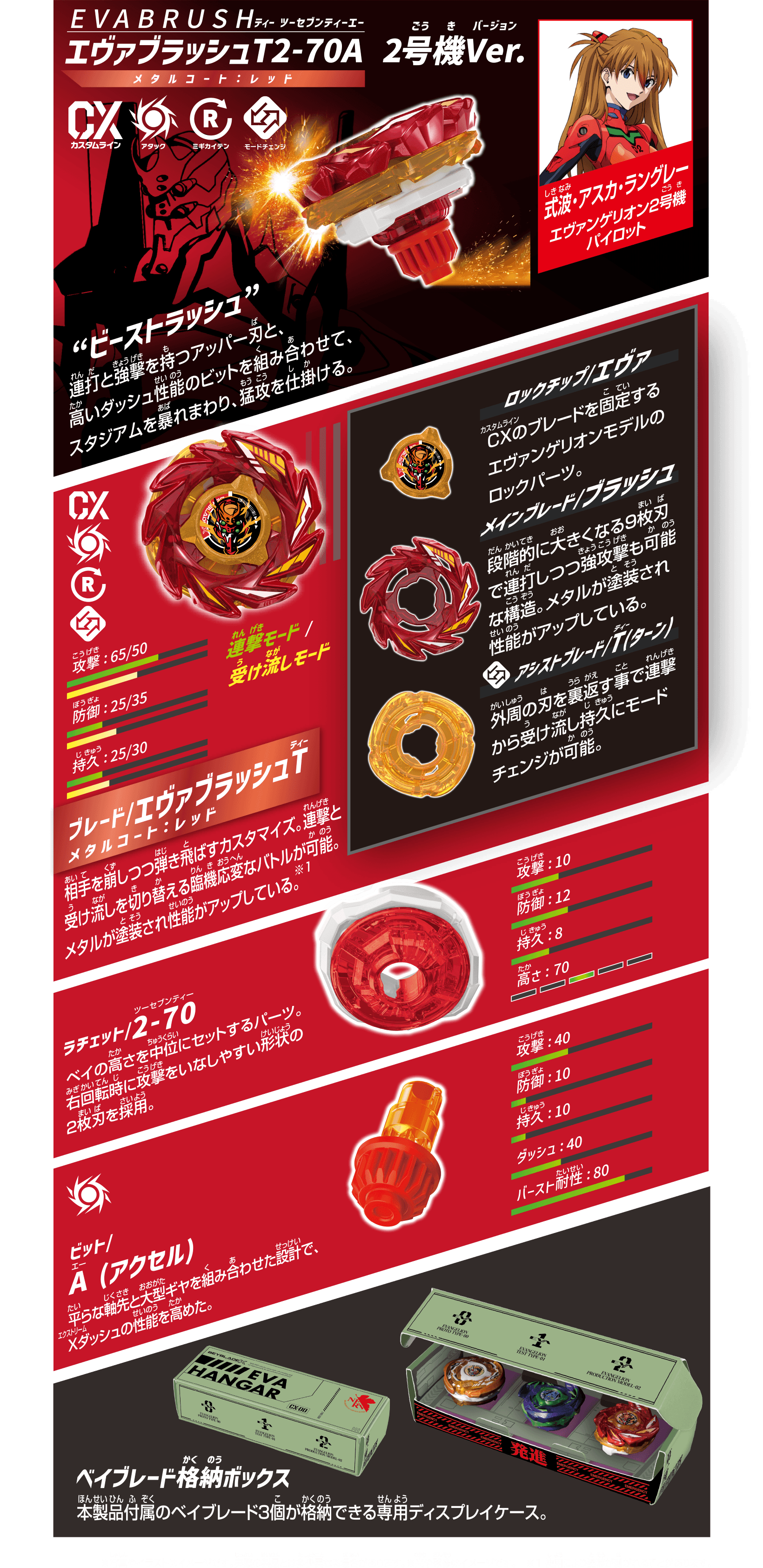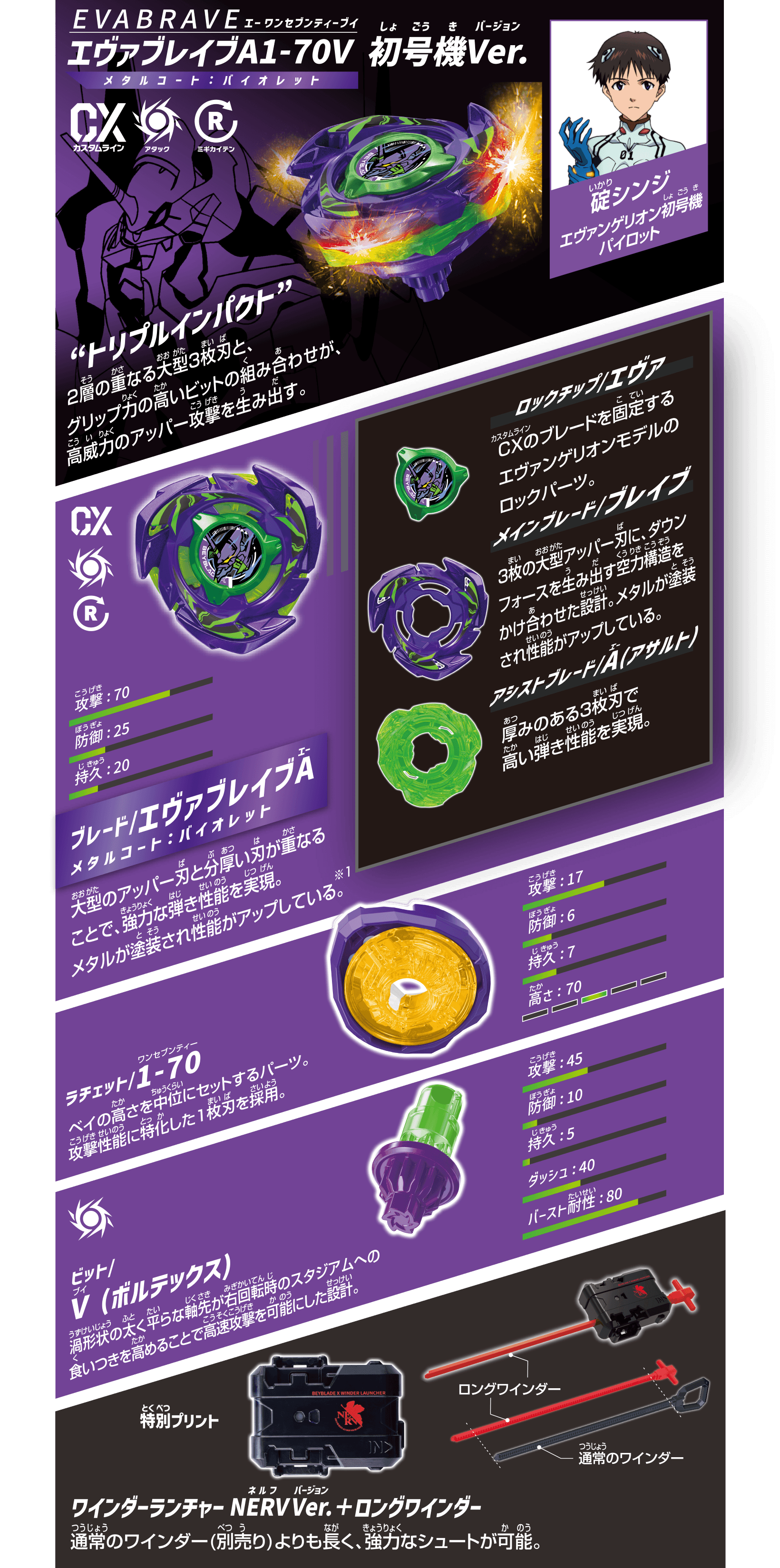 | 商品内容 | ブレード(3)、ラチェット(3)、ビット(3), ワインダーランチャー(2)、ロングワインダー(2)、ベイブレード格納ボックス(1)、ベイコードカード(1)、取扱説明書(1) |