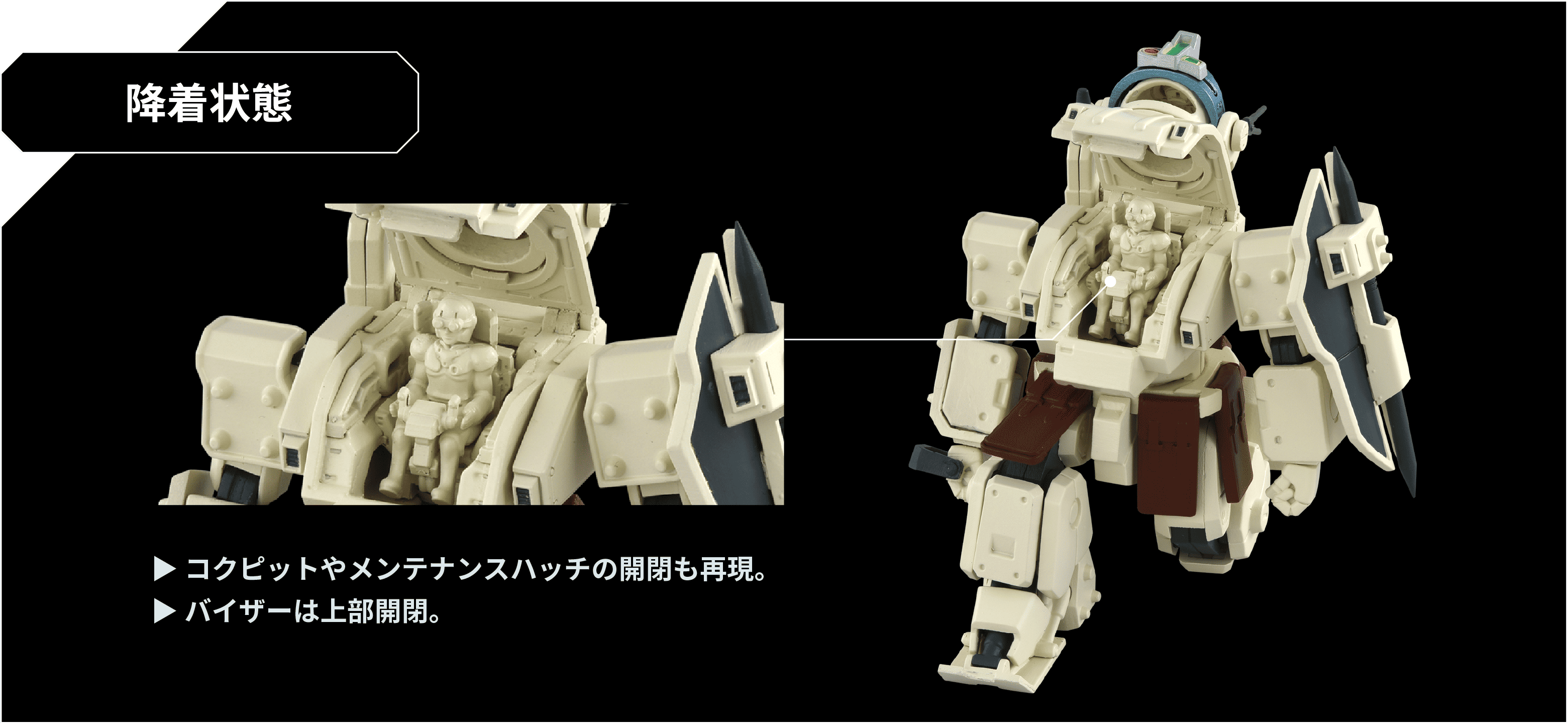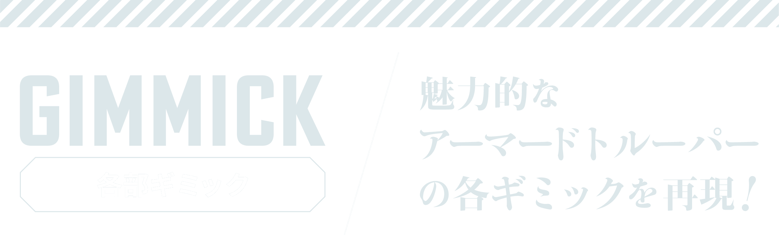 本体のギミックはトイライズATコレクションの有するバイザー、コクピットハッチの開閉、頭部カメラのスライドレールに合わせた左右の移動、シールドのパイルバンカーのニードルパーツのスライド、ザイルスパイドの先端のアンカーパーツの取り外し、右腕のアームパンチ機構の伸縮の再現とナックルガードの展開により、本編に近いイメージでの表現が可能です。