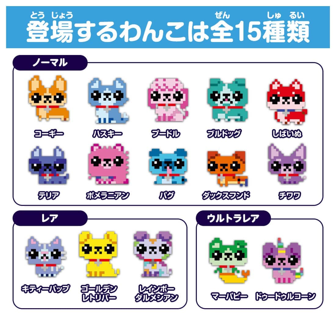 ・キャラクターはノーマル・レア・ウルトラレアの全15種類!お気に入りのわんこを見つけよう。