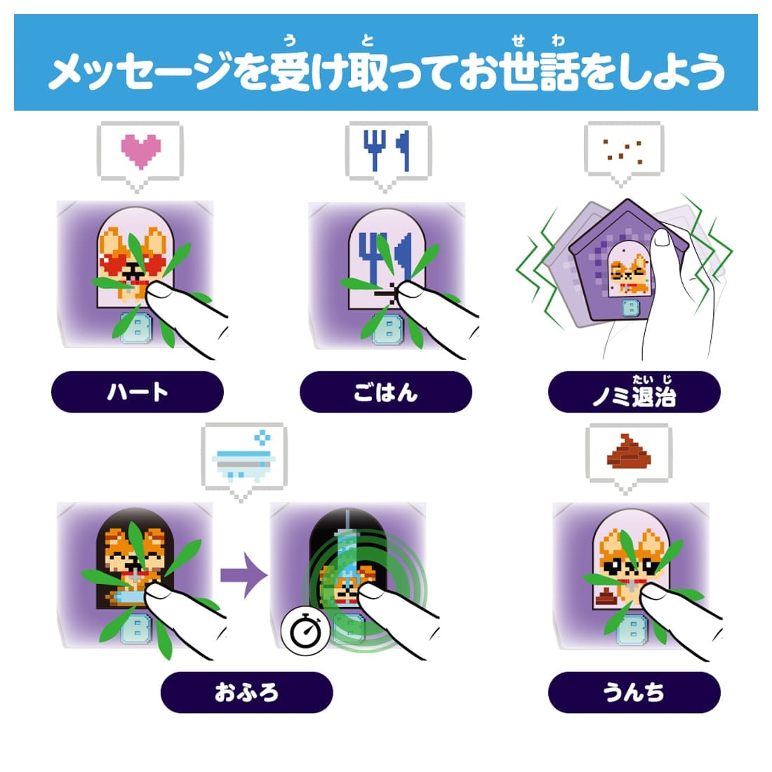 ・わんこは何か必要な時にメッセージを送ってくれるよ。ごはん/おふろ/ノミ退治/うんち などメッセージに合わせてお世話をしよう。