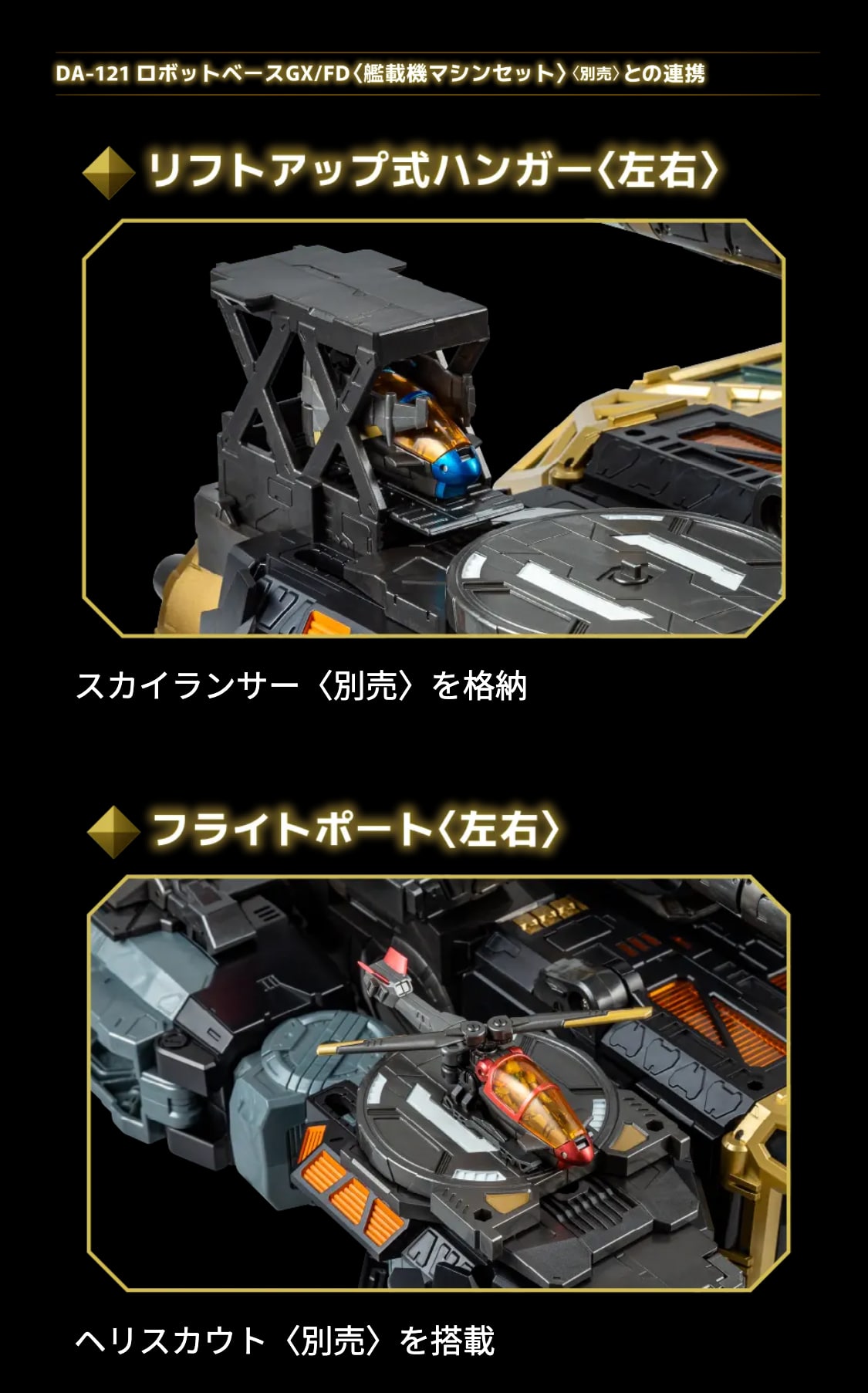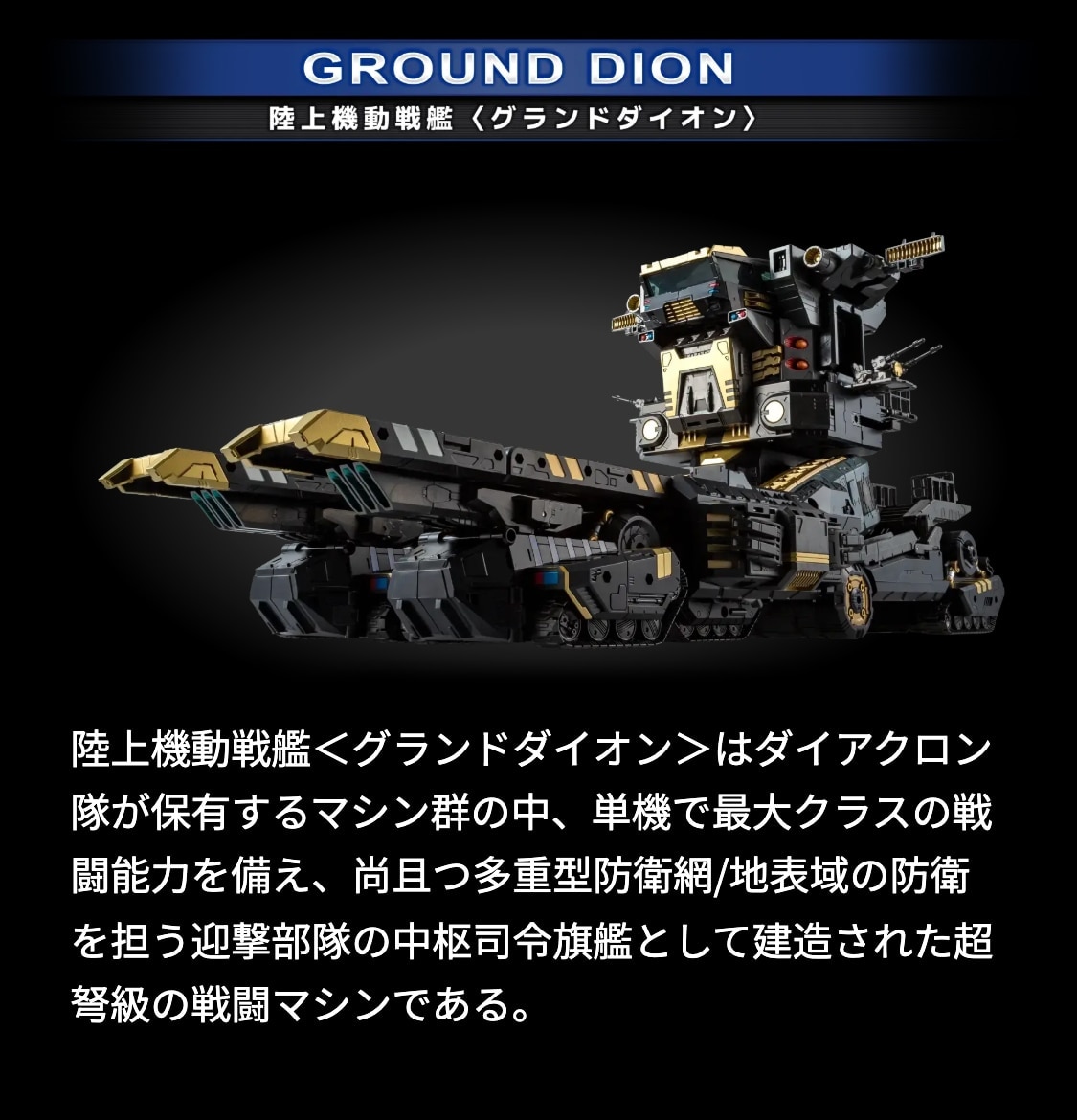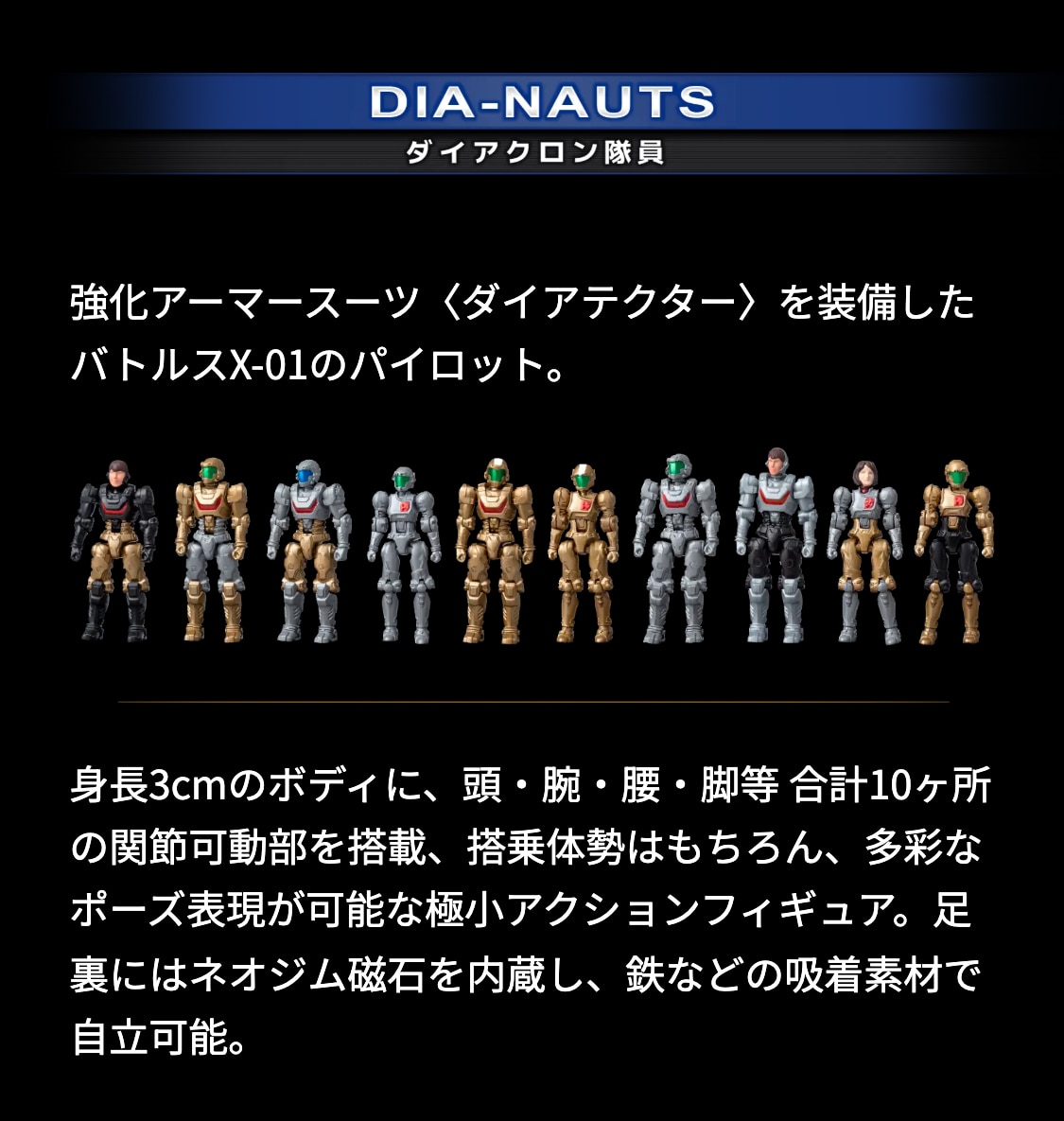 | 商品内容 | 本体一式(1)、大型武器一式(1)、武器A(2)、マシン(1)、ロックパーツ一式(1)、ダイアクロン隊員/Ver.2.0(6)、ダイアクロン女性隊員(4)、スチールシート(1)、パンフレット(1)、取扱説明書(1)、シール(1) |