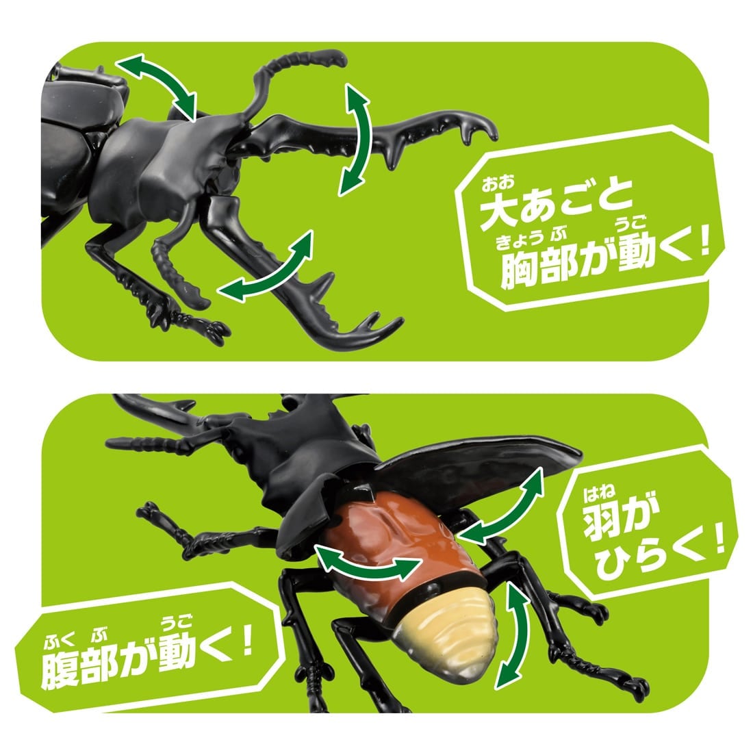 大あご、胸部、腹部が動きます。さらに、羽がひらき飛行ポーズを再現した遊びが楽しめます。
