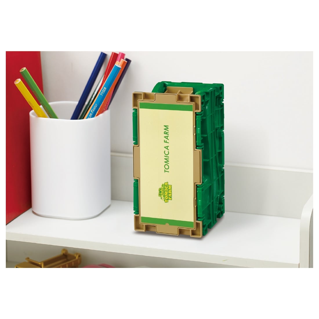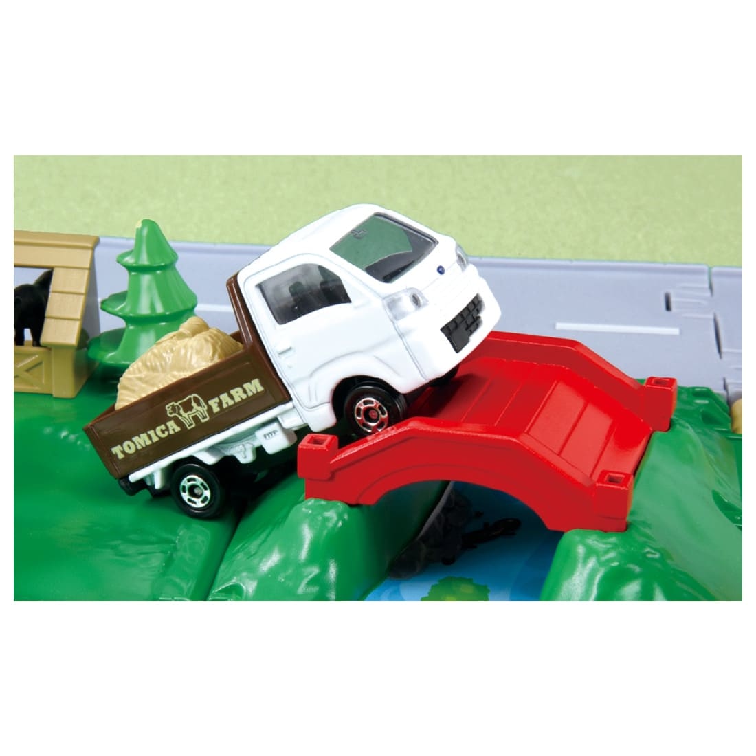 | 商品内容 | トミカタウン牧場(1)、エサ(干し草)(1)、ウシ(4)、ウマ(4)、ブタ(4)、スズキ キャリイ 牧場トラック (1)、スバル サンバー 牧場トラック (1)、サイロ屋根パーツ(1) |