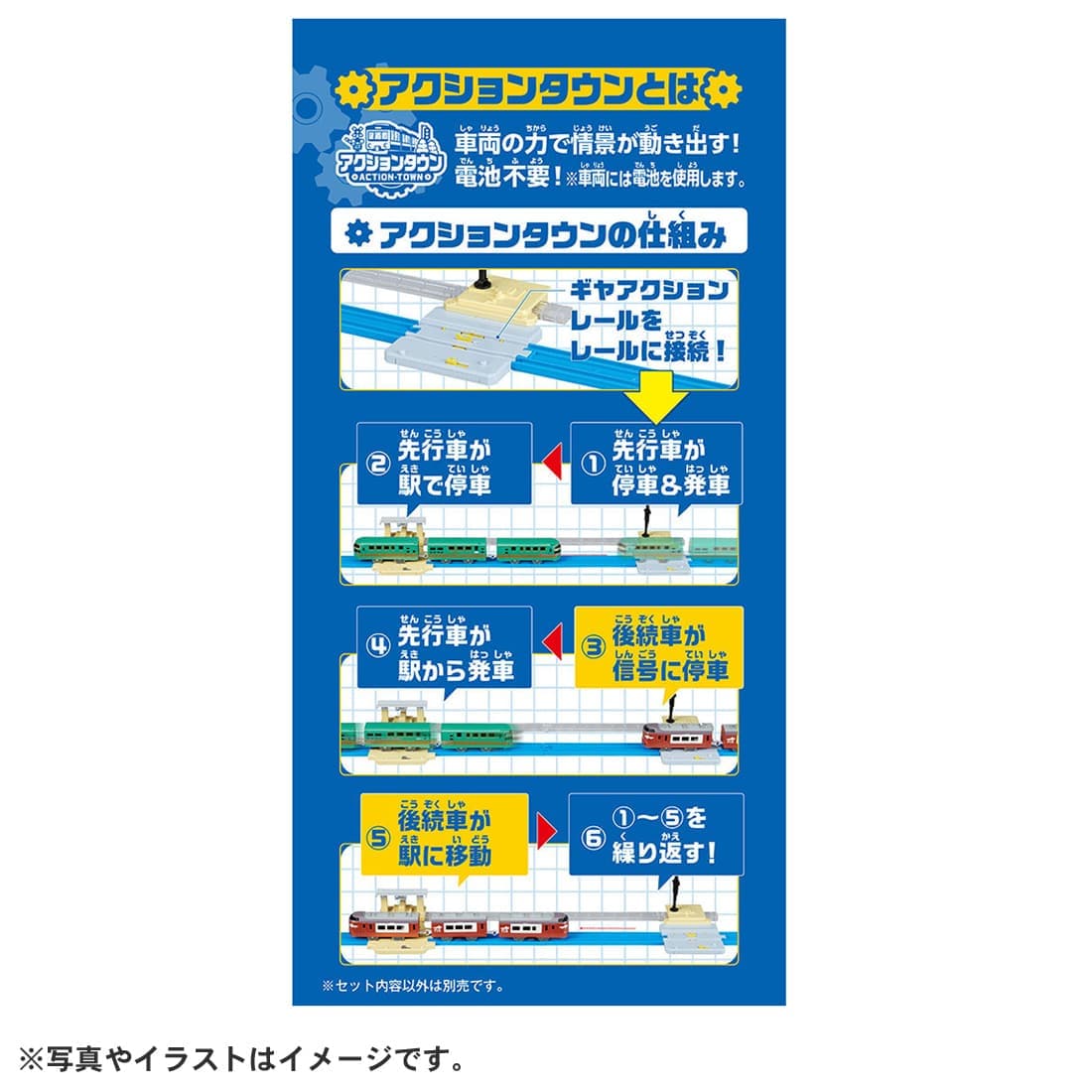 ※連続発車駅を機能させるために2編成のプラレール車両が必要になります。(車両は各3両以下で遊んでください。)