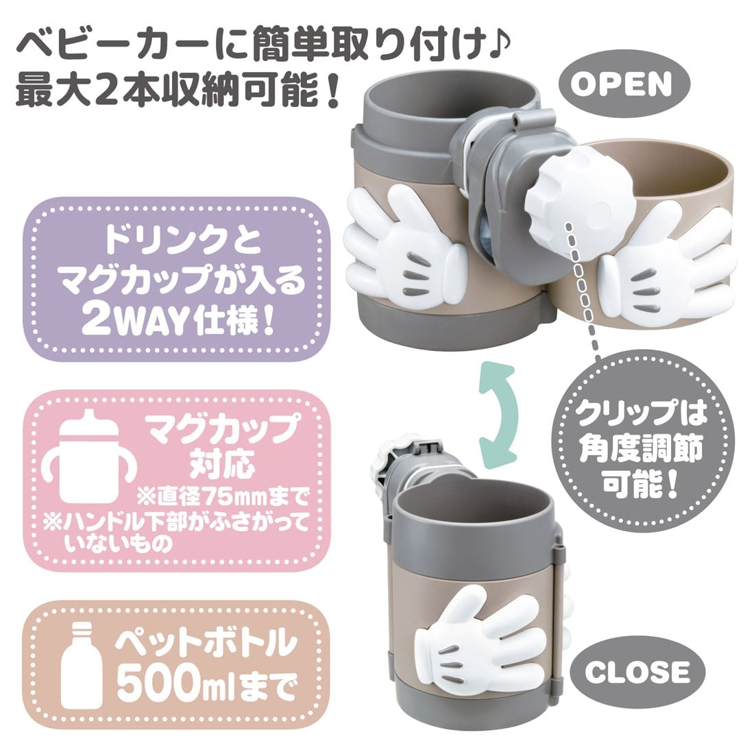 ベビーカーにかんたん取り付け!ペットボトルやマグカップを最大2つまで収納可能なミッキーの2WAY仕様のドリンクホルダーです。開くだけで簡単にドリンクを1つ収納と2つ収納に切り替えられるので、シーンに合わせて使い分けられます。