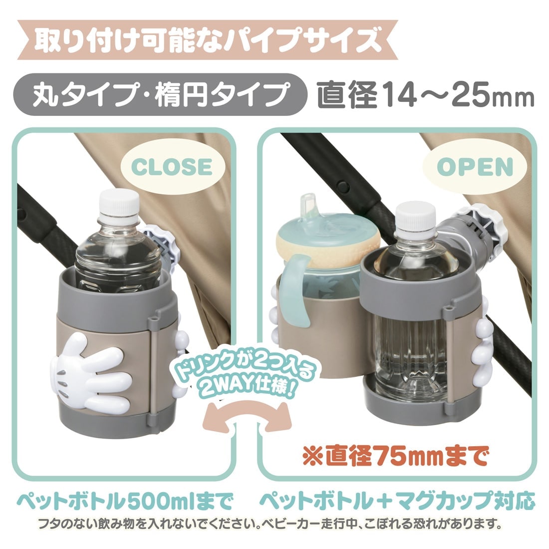 ※フタのない飲み物は入れないでください。ベビーカー走行中こぼれる恐れがあります。