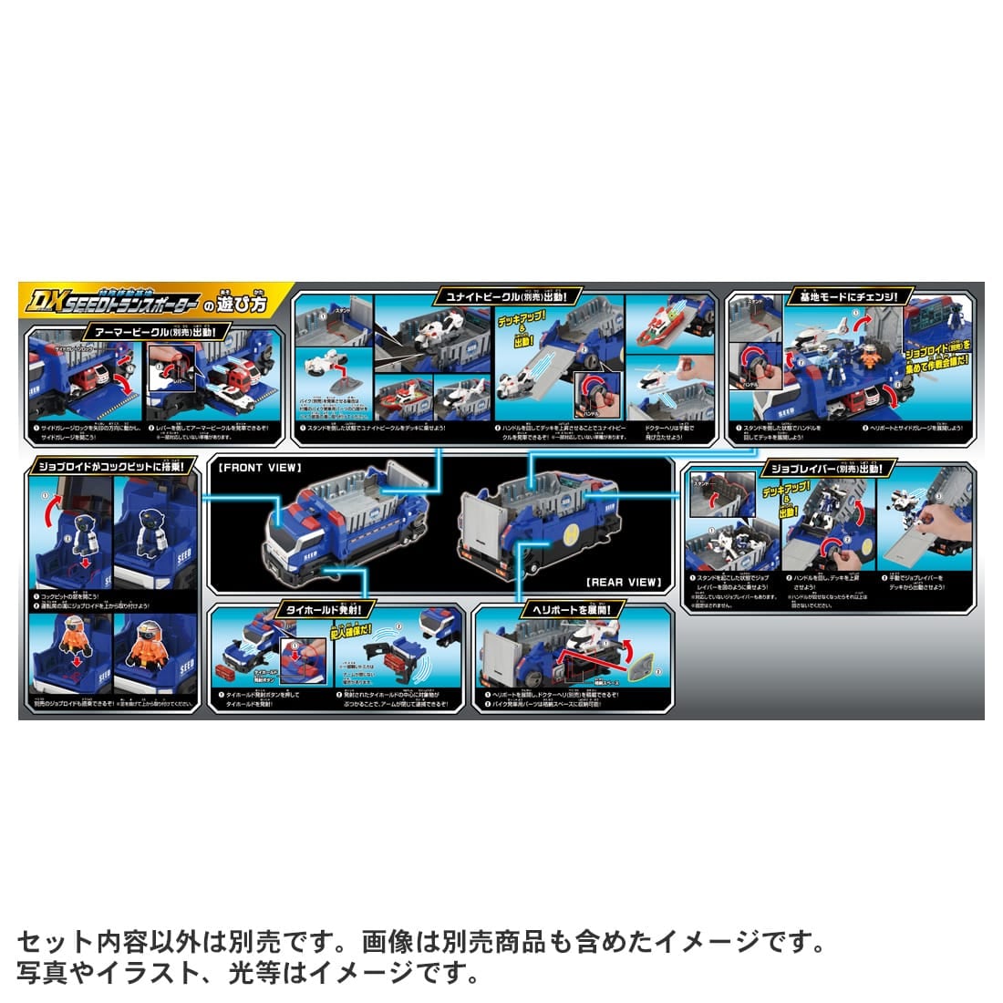 | 商品内容 | SEEDトランスポーター本体(1)、タイホールド(1)、アーム(左)(1)、アーム(右)(1)、スロープ(1)、警察ジョブロイド(1)、バイク発車用パーツ(1)、シール(1) |
