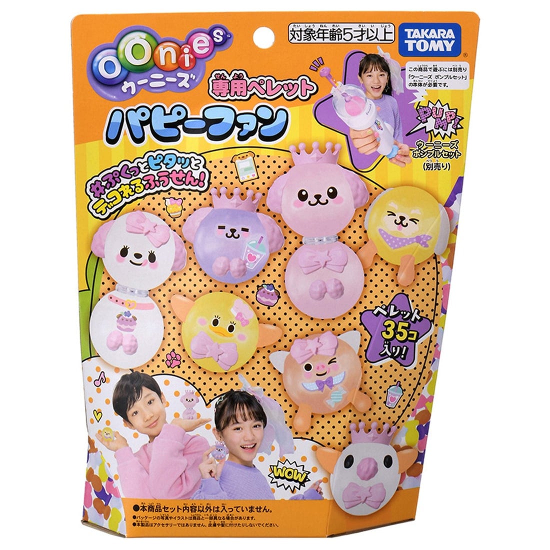 ペレット(ホワイト、ピーチピンク、バイオレットパープル 、レモンイエロー 、ブラウン…各7個)が35個とつなぎパーツが6個、デコパーツが18個、目(大・小…各4個)が8個、ディスプレイパーツが6個、デコシールシートが3枚入っているよ!いーっぱいふくらませて、くっつけて楽しもう!