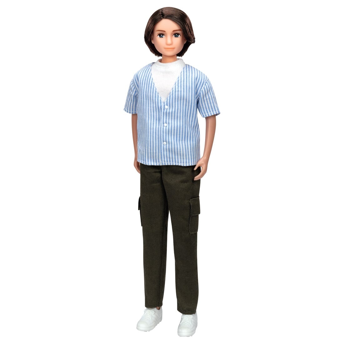 インナーが白いTシャツのブルーストライプシャツにカーキのパンツ、白いスニーカーを合わせたさわやかコーデ。やさしくてカジュアルなリカちゃんのパパです。