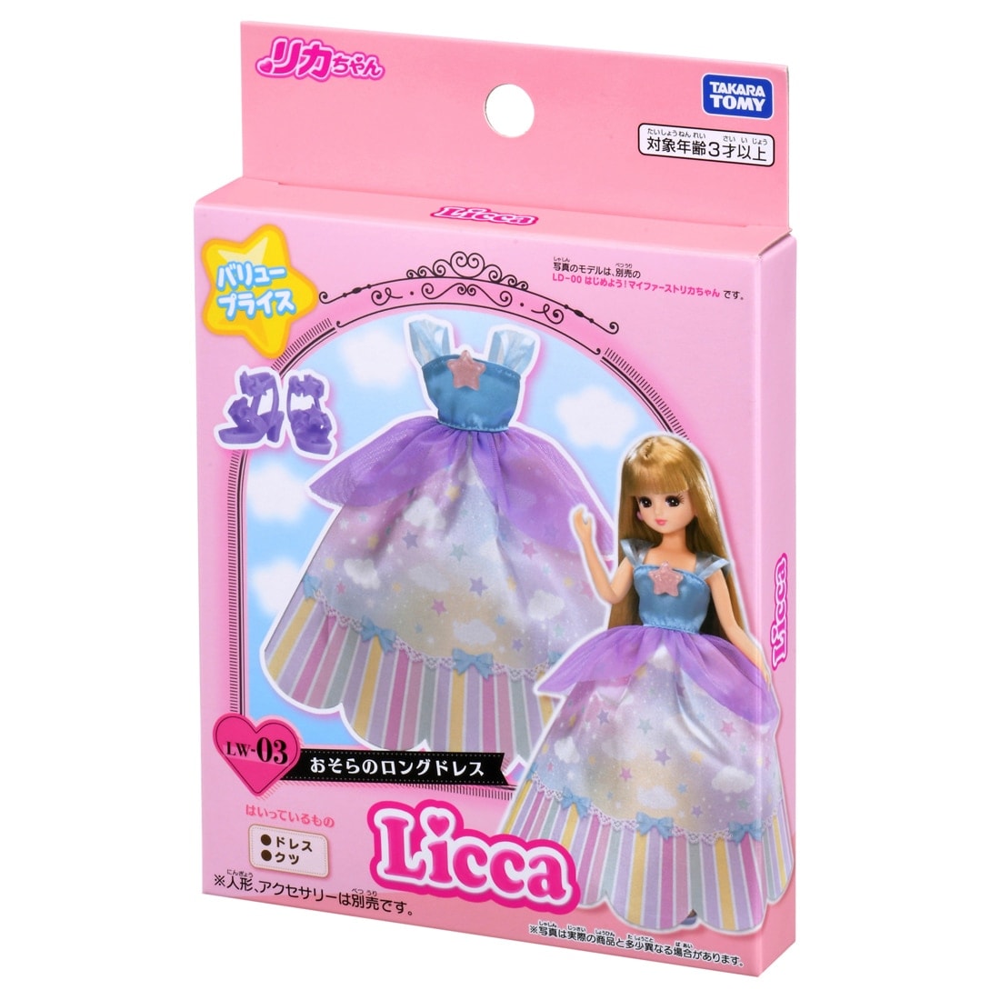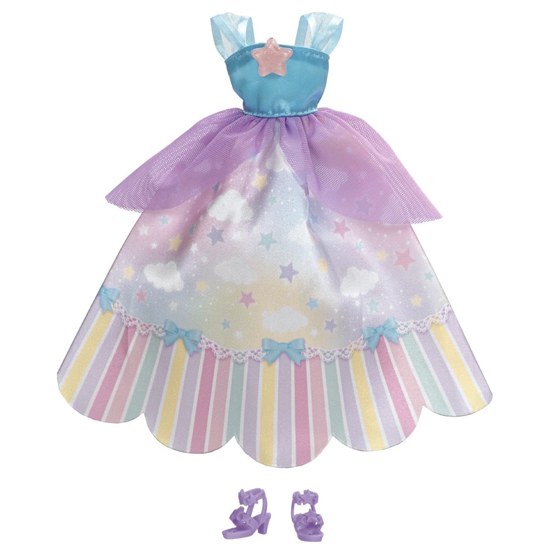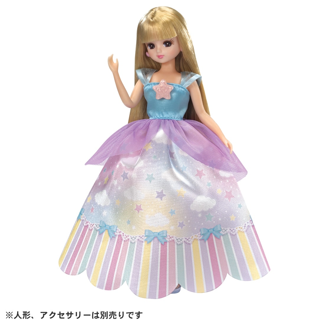 胸のお星さまがワンポイントのにじいろお空デザインがかわいいロングドレスです。パープルのスターサンダル付き。