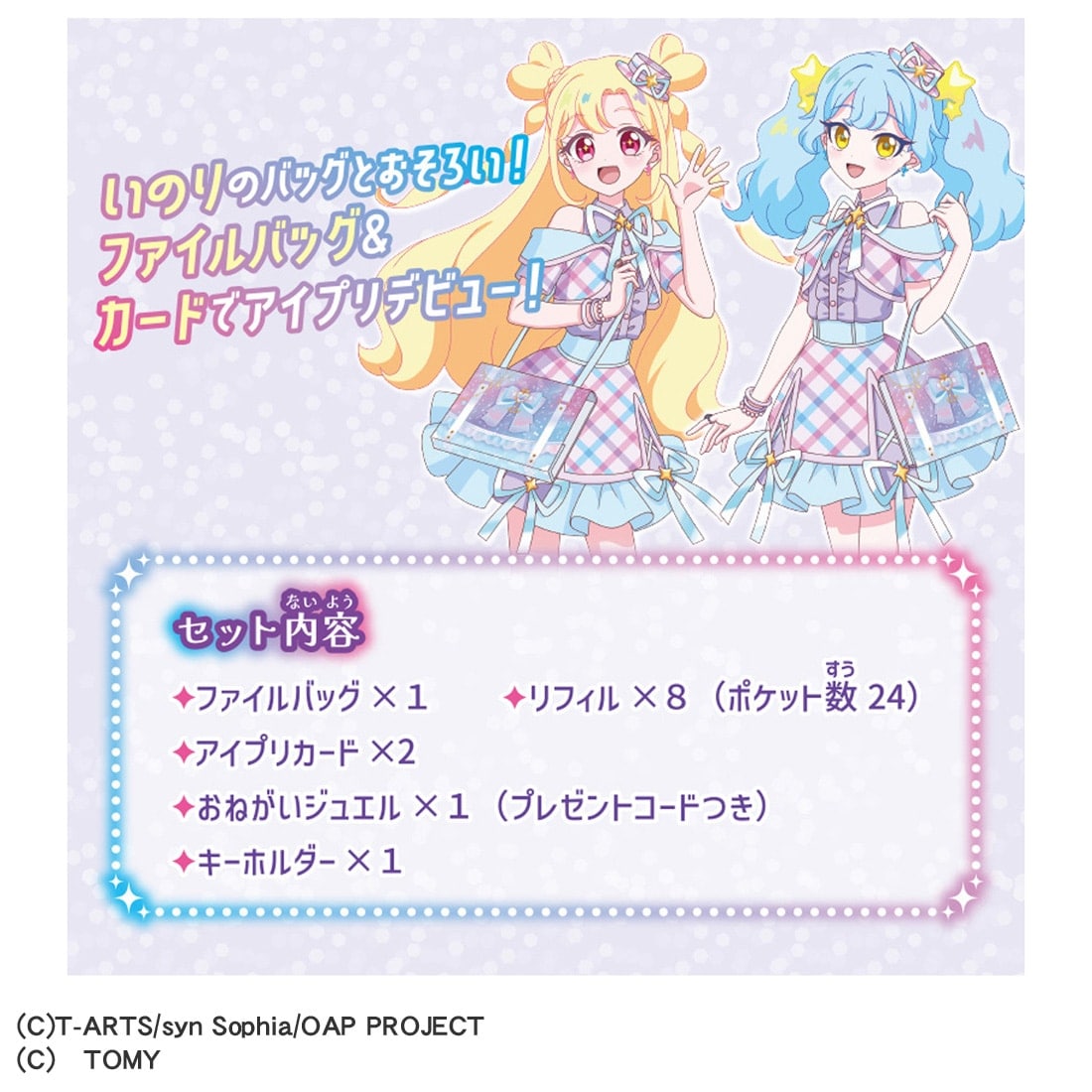 | 商品内容 | ファイルバッグ(1)、リフィル(8)、アイプリカード(2)、おねがいジュエル(プレゼントコードつき)(1)、キーホルダー(1) |