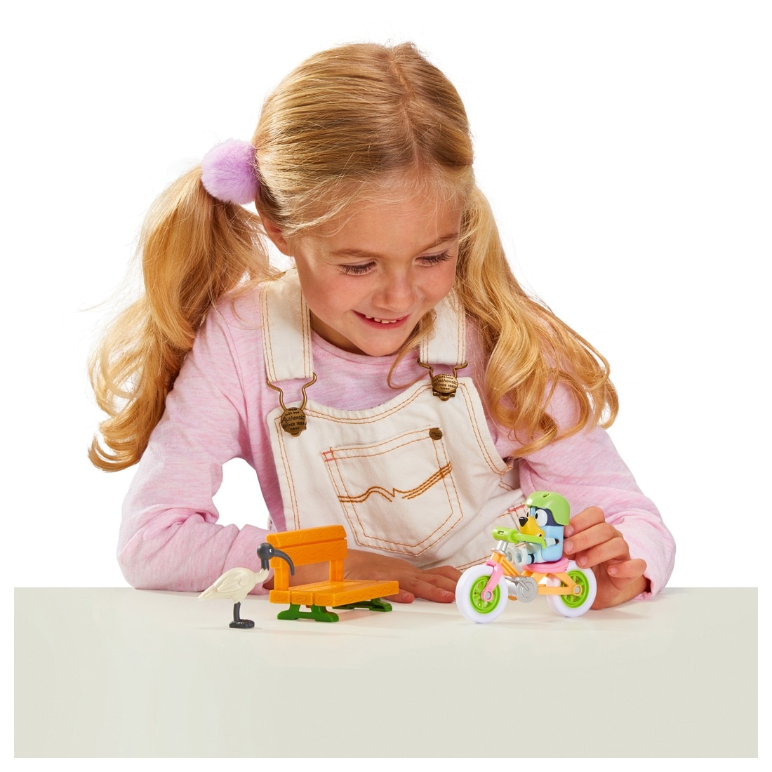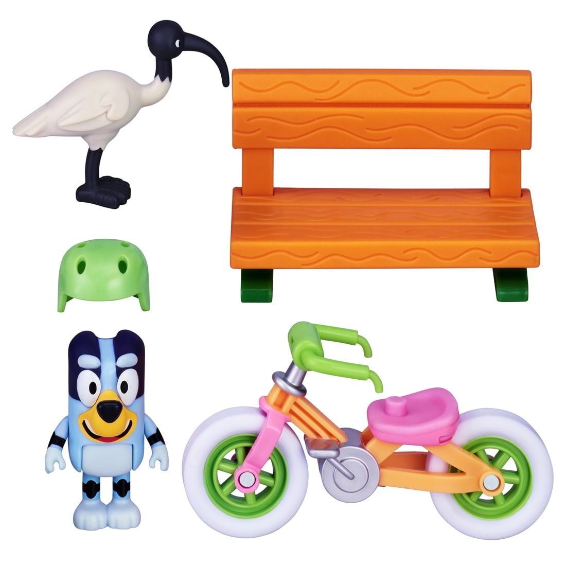 ブルーイのフィギュアとヘルメット、じてんしゃ、ベンチ、鳥がついています。