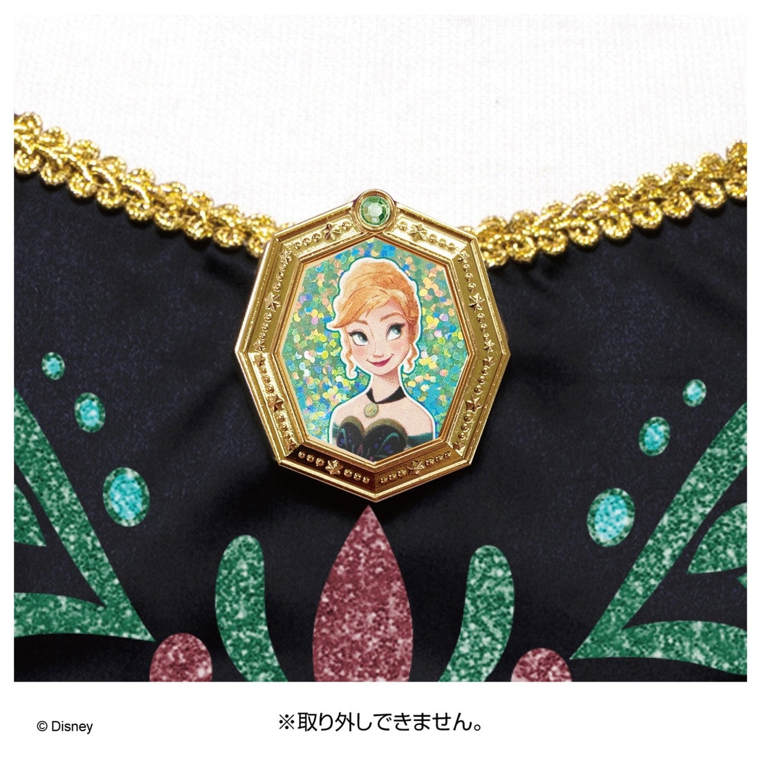 ・胸元はシックな黒にカラフルなプリント、アナのイラスト入りのブローチがポイントに!