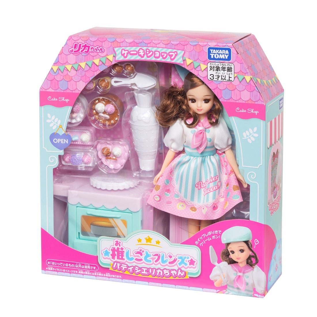 | 商品内容 | 人形(ドレス、下着、イヤリング着用)(1)、クツ(1)、帽子(1)、ケーキショップ本体(1)、ケーキショップテーブル(回転テーブル付き)(1)、サイドテーブル(1)、ショーケース(中板付き)(1)、ホイップしぼりき(1)、ホイップパーツ(ホワイト、ピンク、ブラウン各6)(18)、ケーキサーバー(1)、ハートケーキ(1)、ホールケーキ(ホワイト、ブラウン各1)(2)、スクエアケーキ(ホワイト、ピンク各1)(2)、カップケーキ(3)、デコパーツ(5)、推しごとフレンズブック(1)、紙こものシート(1)、背面ボード(1) |