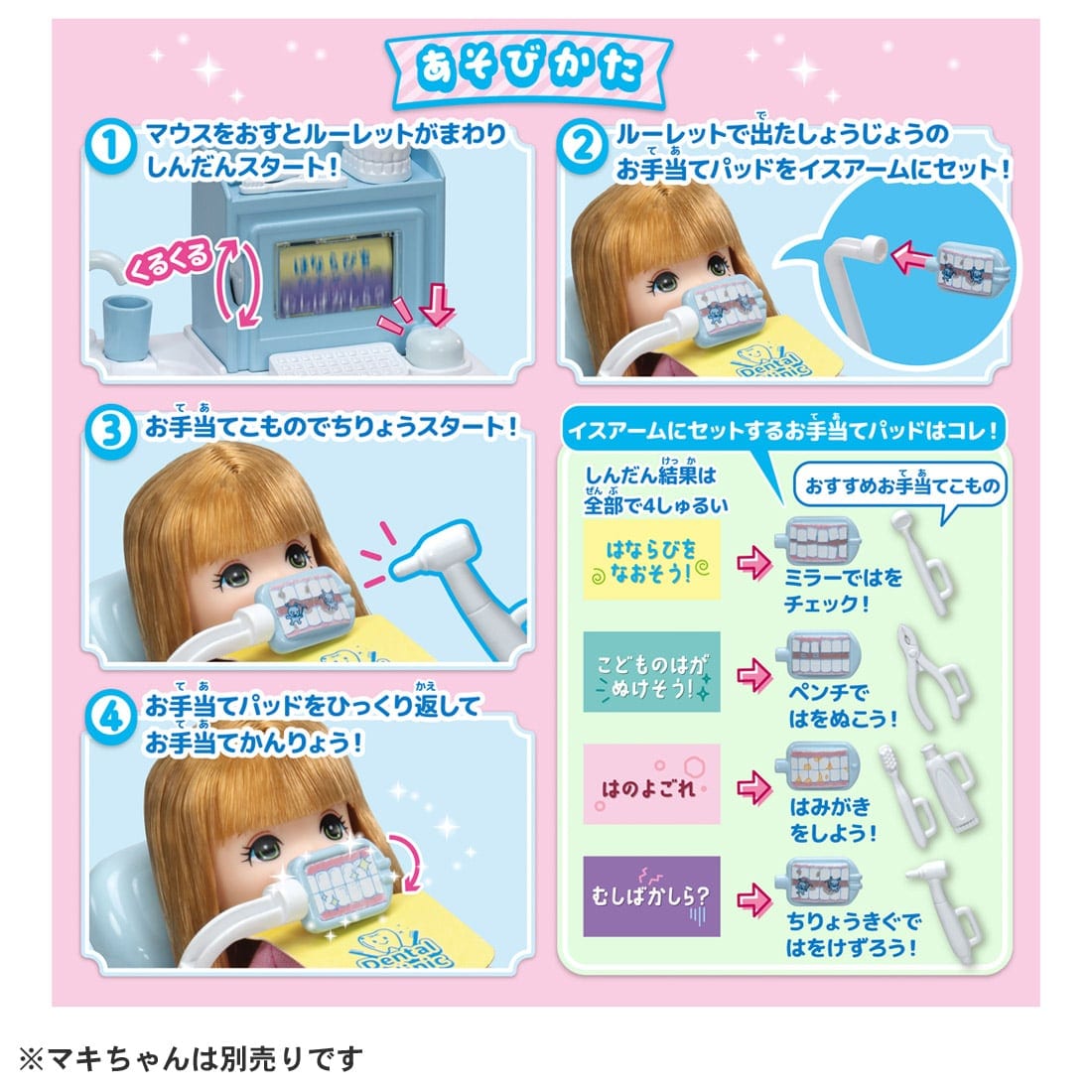 | 商品内容 | 人形(ドレス、下着、ソックス、イヤリング着用)(1)、クツ(1)、はいしゃ本体(1)、はいしゃテーブル(ルーレットパソコン、マウス付き)(1)、イス(台座、本体)(1)、イスアーム(1)、じゃぐち(1)、コップ(1)、お手当てパッド(4)、お手当てこもの(5)、はのもけい(1)、推しごとフレンズブック(1)、紙こものシート(1)、背面ボード(1) |