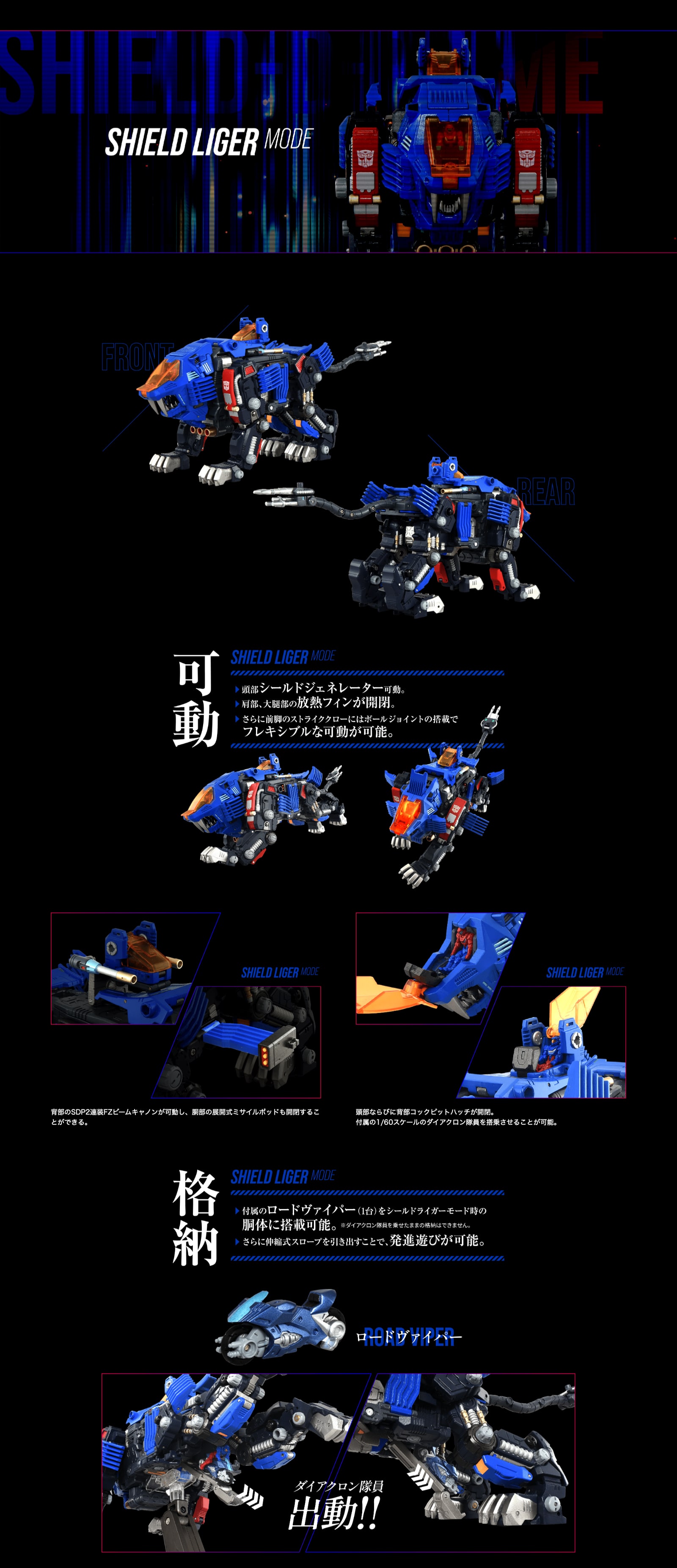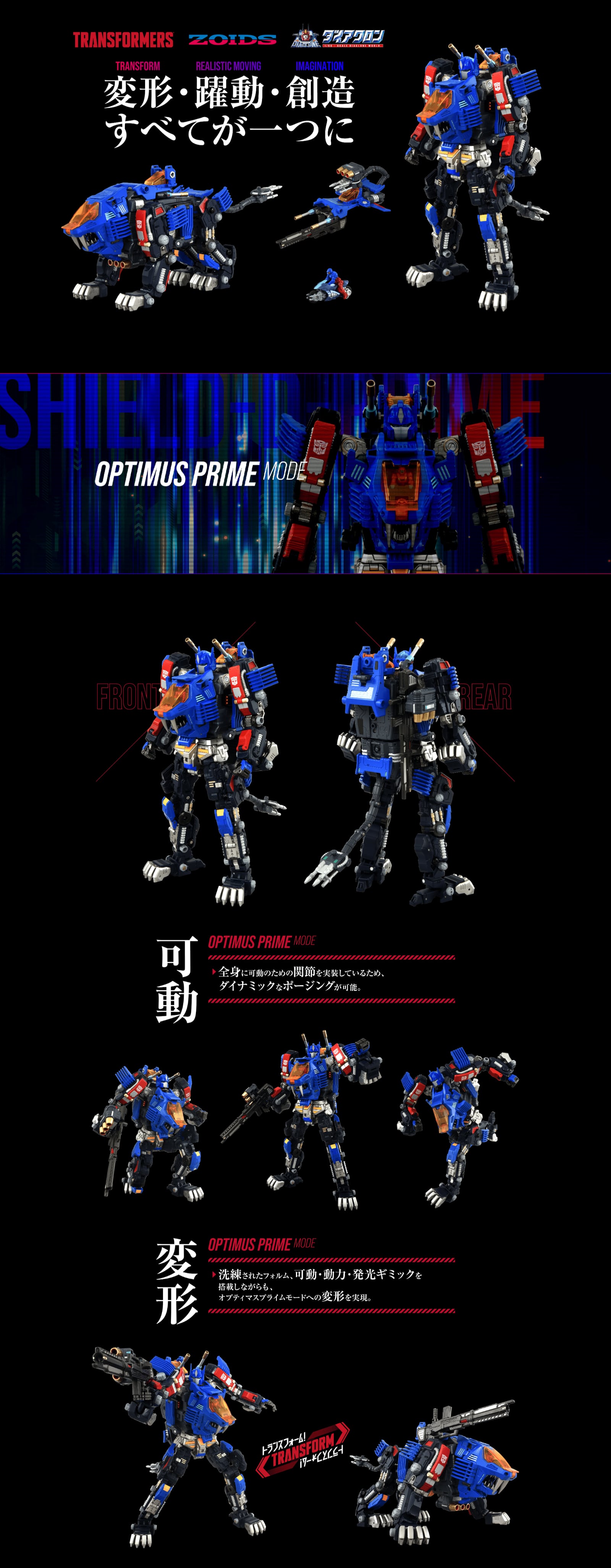 ゾイドの「シールドライガー」をモチーフにした「シールドライガーモード」から、トランスフォーマーの「オプティマスプライム」をモチーフにした「オプティマスプライムモード」に変形が可能。