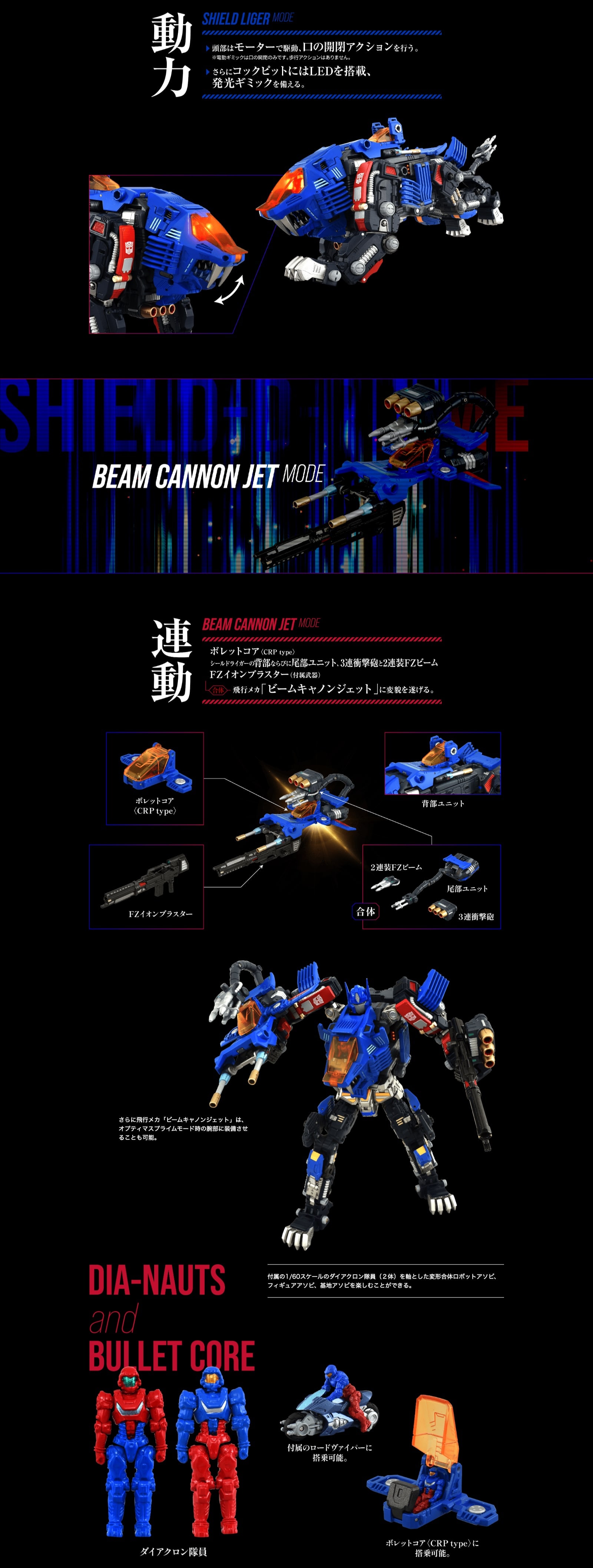 さらにシールドライガーモードでは、頭部のシールドジェネレーターや脚部のフィンが可動するほか、背面の2連装ビームキャノンや胴体側面のミサイルポッドの展開が可能。