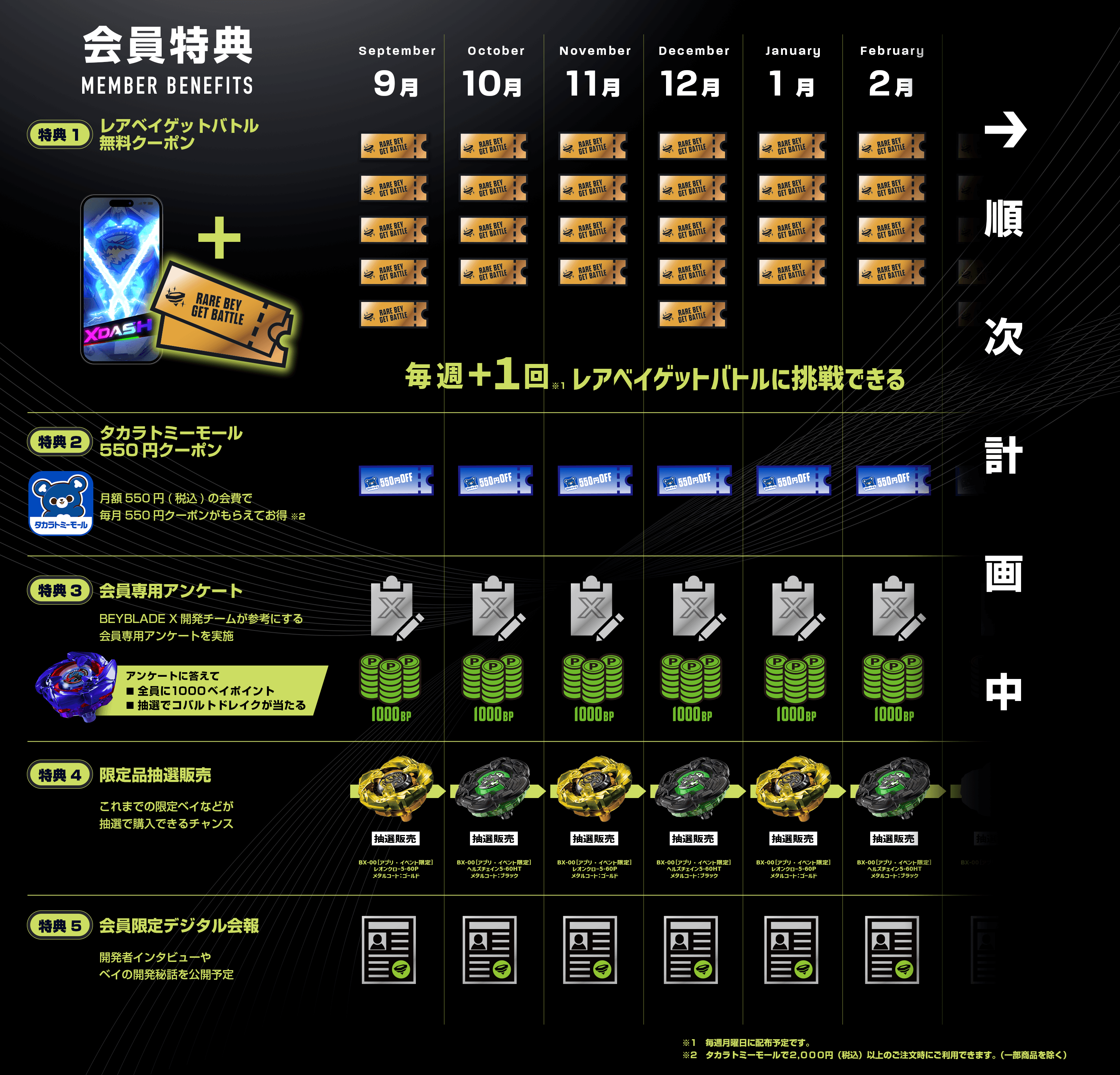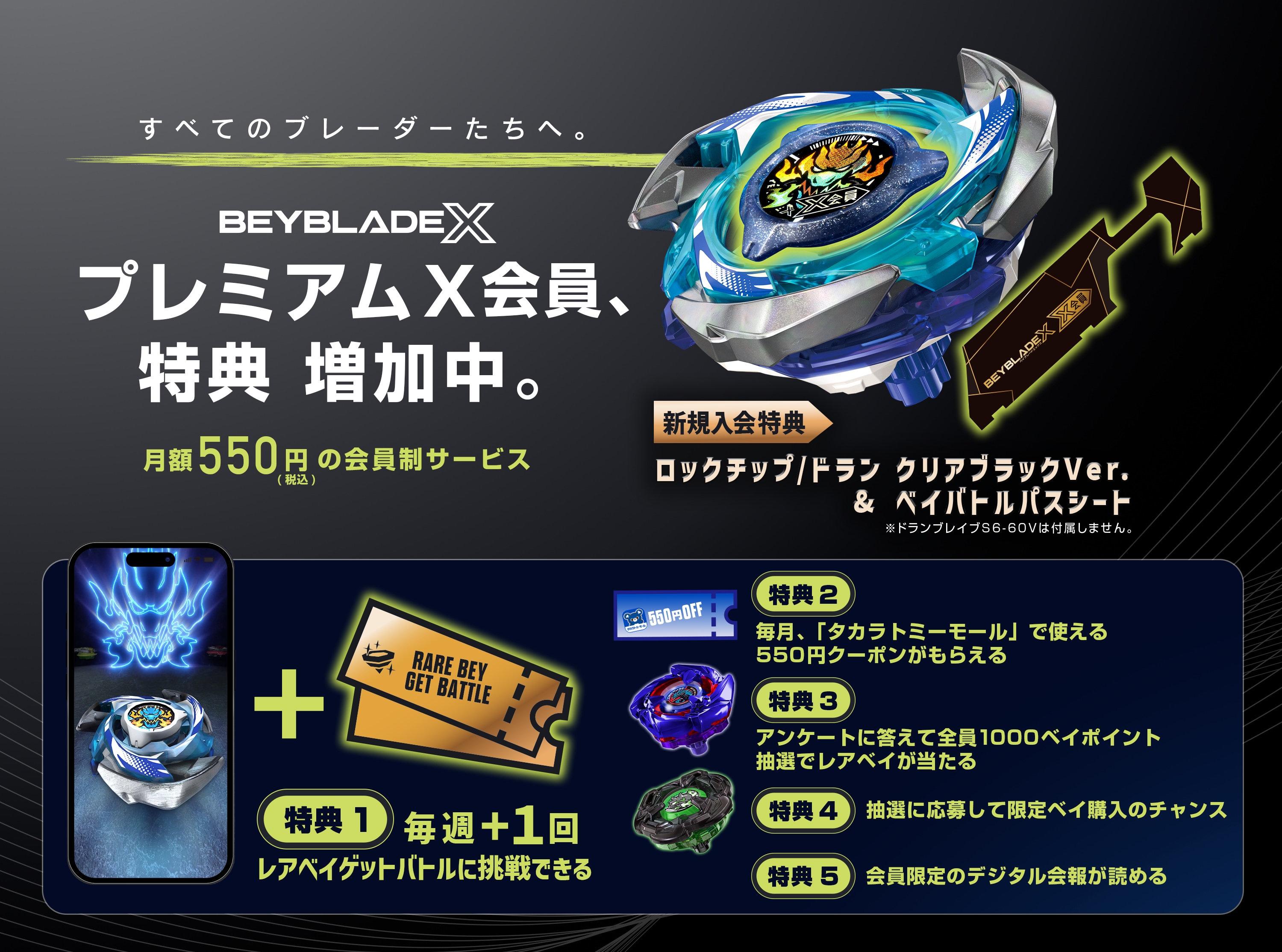 - ・新規入会特典「CX-00 ロックチップ/ドラン クリアブラックVer. & ベイバトルパスシート」用クーポン(有効期限内のもの)