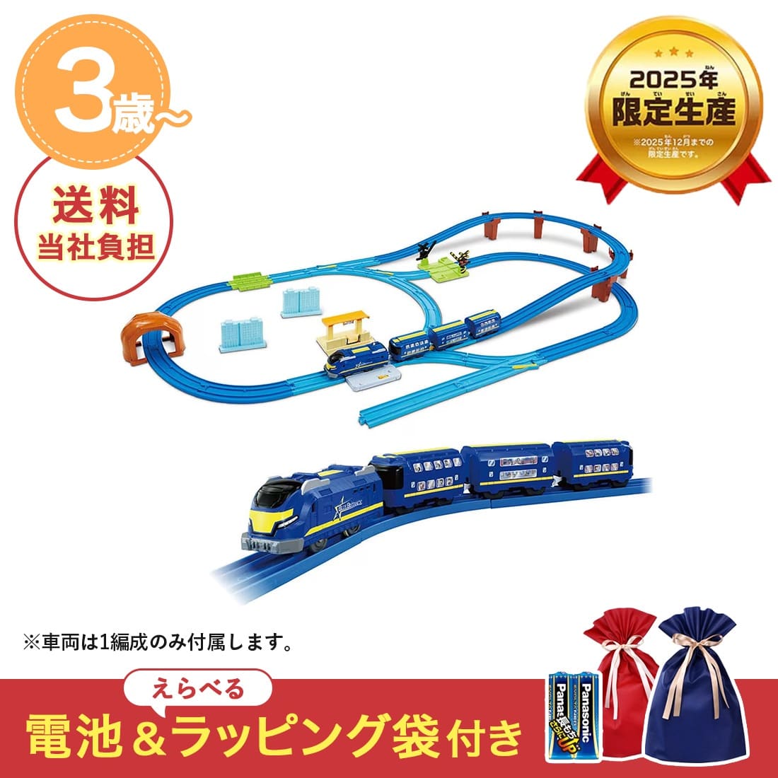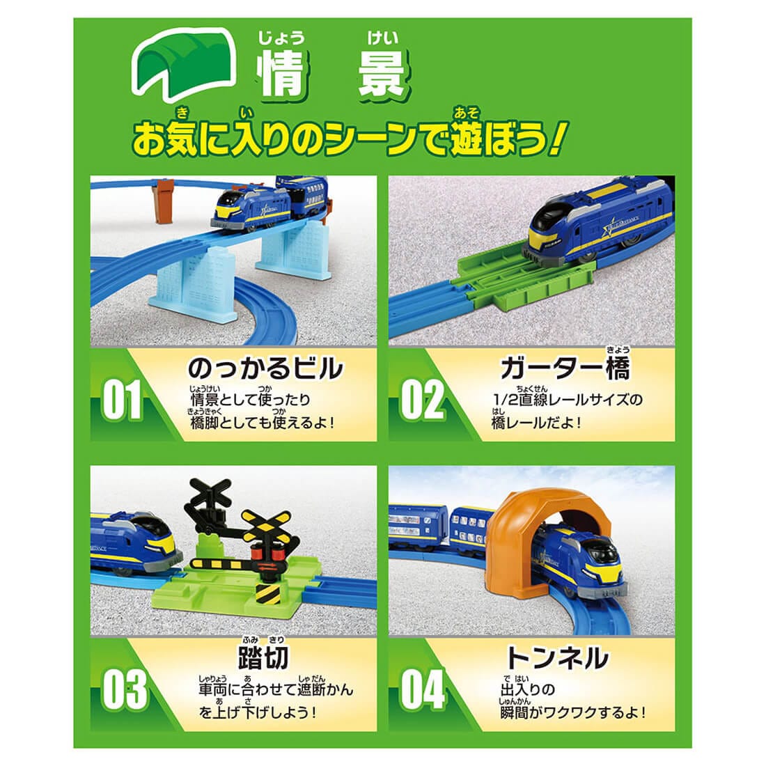プラレール鉄道初の4両編成新車両「ブルーディスタンス」や、車両の力で自動でアクションする新情景シリーズ「アクションタウン」も入っている!