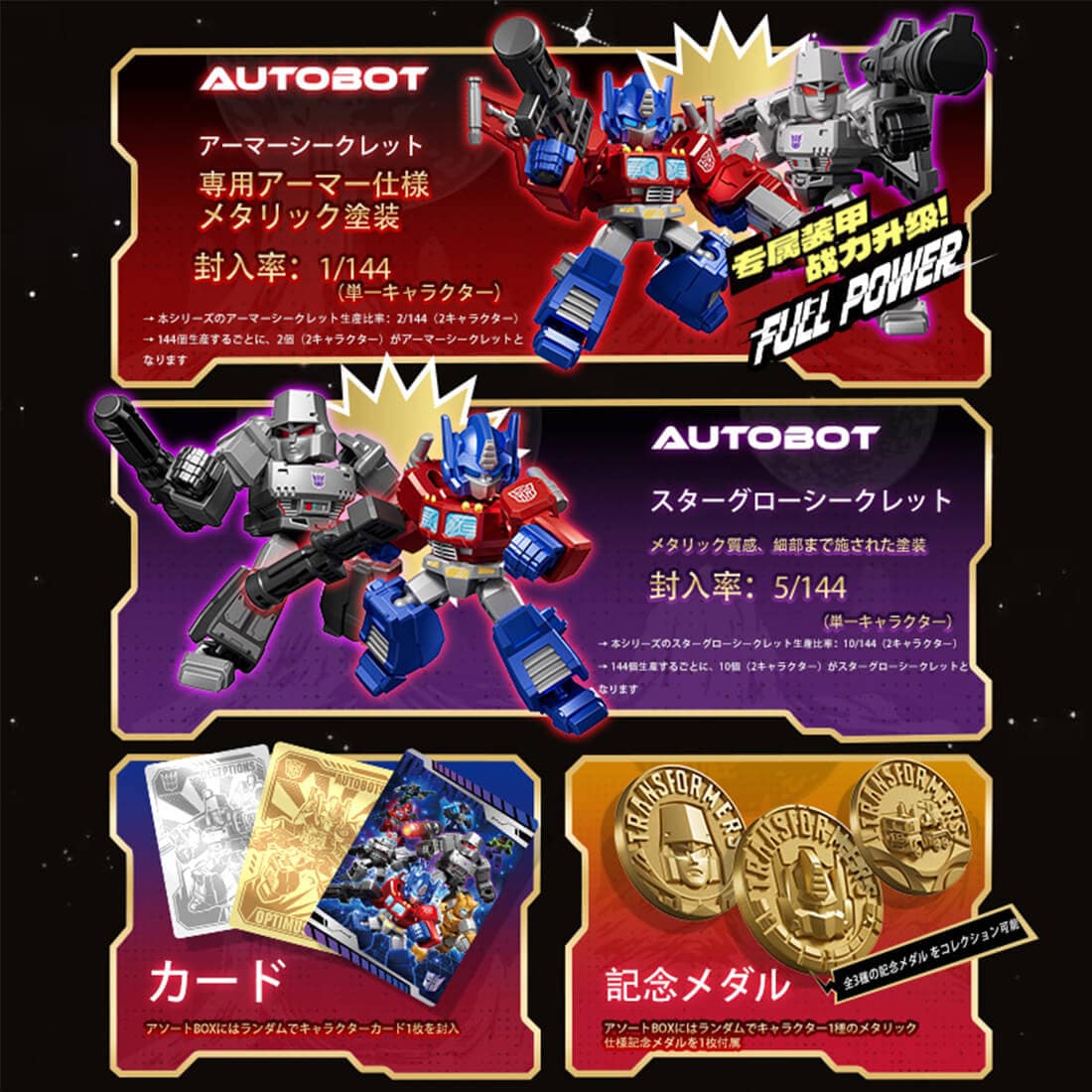 また、各ボックスにはキャラクターカードが1枚付属します。さらに、アソートBOX(12個入り)ごとに、ランダム仕様のコレクション用スペシャルカードが各1点封入されており、