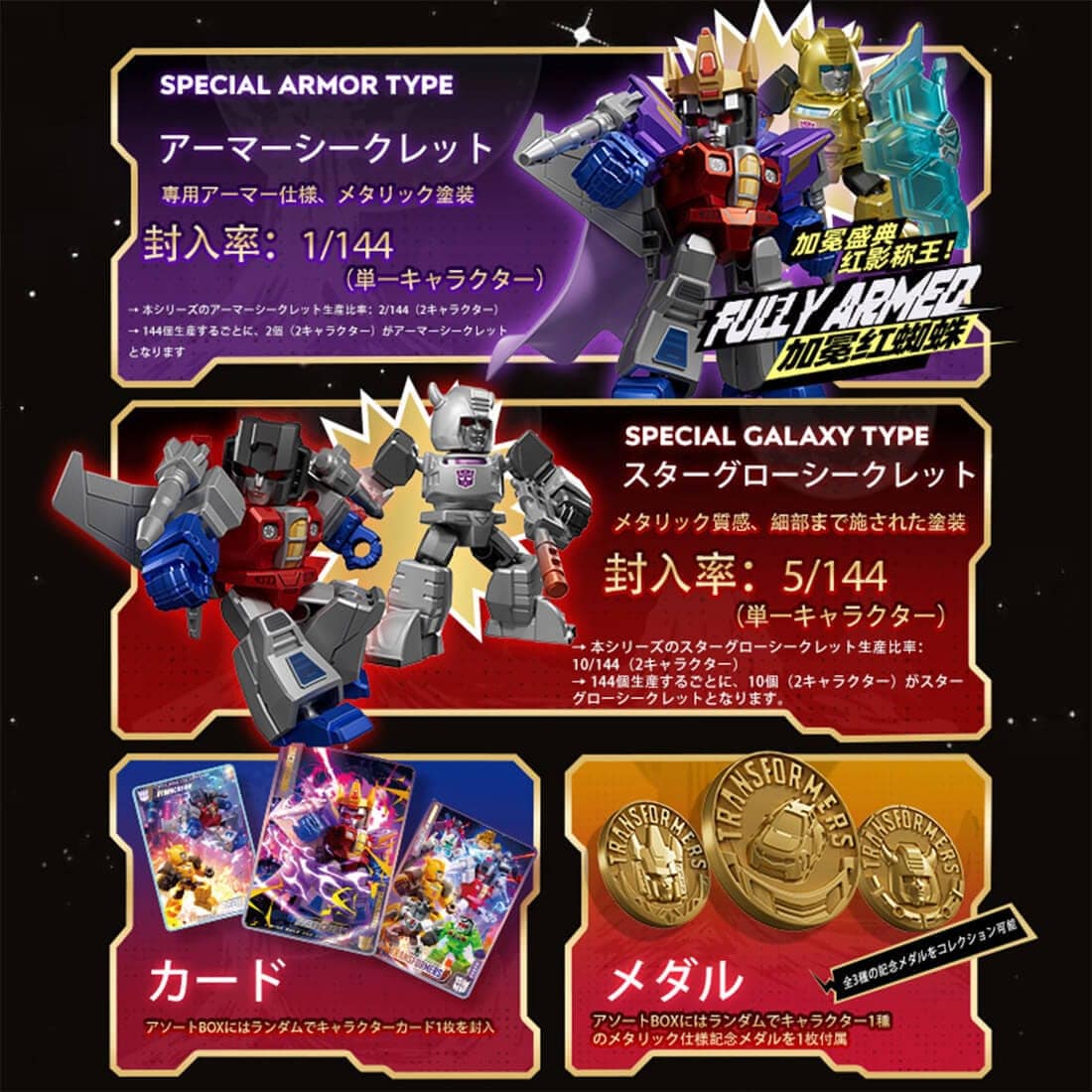 12個入りのアソートBOXには、特別仕様モデルが含まれています。特別カラー仕様や装甲を強化した特別仕様に加え、開封するまで中身が分からないシークレットモデルも存在します。